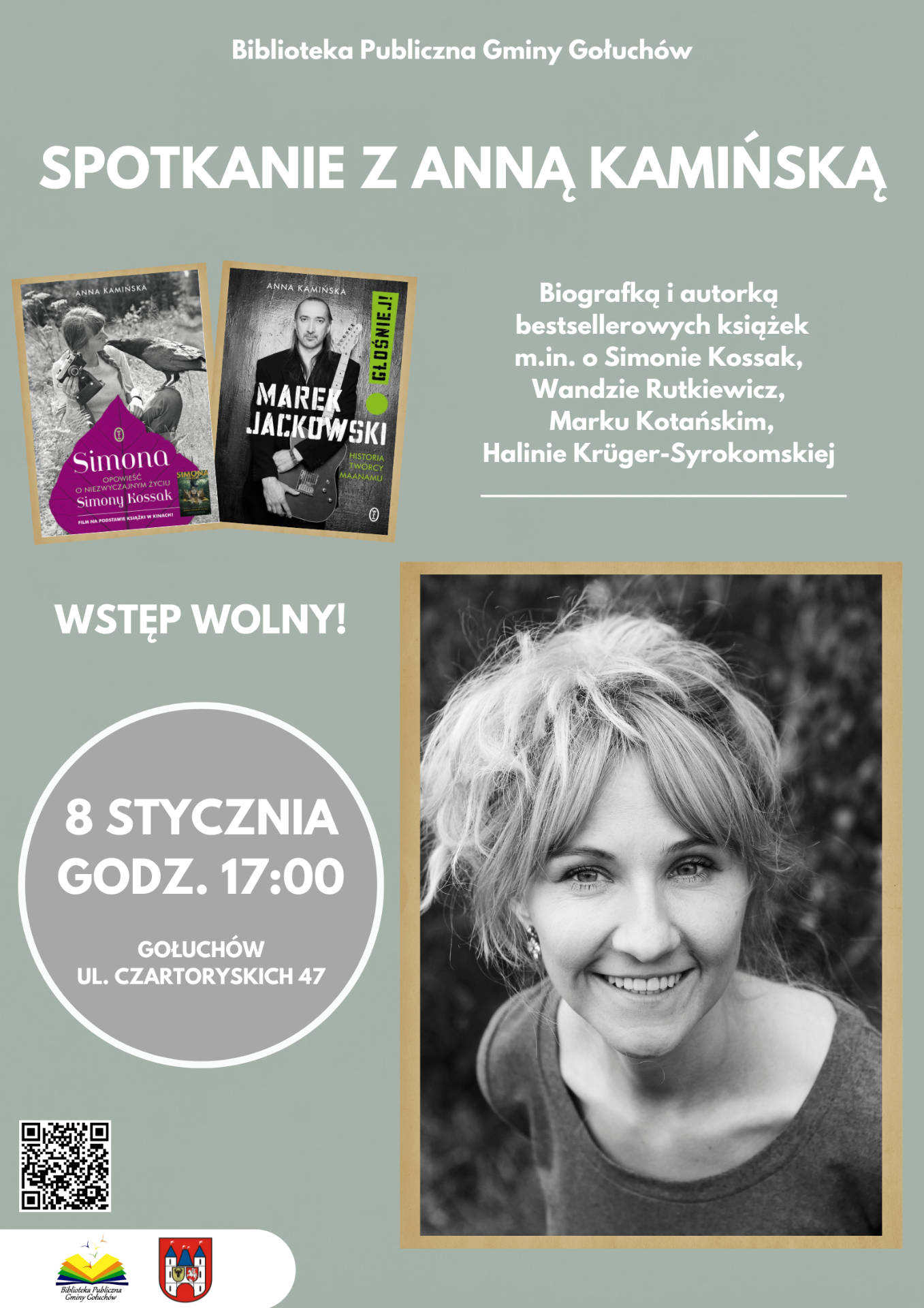 Anna Kamińska - autorka książek, w tym bestsellerowych biografii „Wanda. Opowieść o sile życia i śmierci” (2017), „Simona. Opowieść o niezwyczajnym życiu Simony Kossak” (2015), „Kotański”. Bóg Ojciec. Konfrontacja (2021). Laureatka Nagrody Literackiej Prezydenta Miasta Białegostoku im. Wiesława Kazaneckiego za książkę „Białowieża szeptem”. Z kolei za książkę „Halina” otrzymała Nagrodę Literacką Zakopanego w 2020 oraz Grand Prix w konkursie na Książkę Górską Roku 2019 na XXIV Festiwalu Górskim im. Andrzeja Zawady w Lądku-Zdroju. „Halina” okazała się także bezkonkurencyjna w plebiscycie na Książkę Sportową Roku 2019 w kategorii „Najlepsza Książka Górska”. Na podstawie jej biografii Simony Kossak powstał spektakl teatralny „Simona K. Wołająca na Puszczy”. Ostatnią książką Kamińskiej jest biografia Marka Jackowskiego, lidera zespołu MAANAM „Głośniej!” nominowana w 2024 do "Wawrzynu" Nagrody Literackiej Warmii i Mazur.