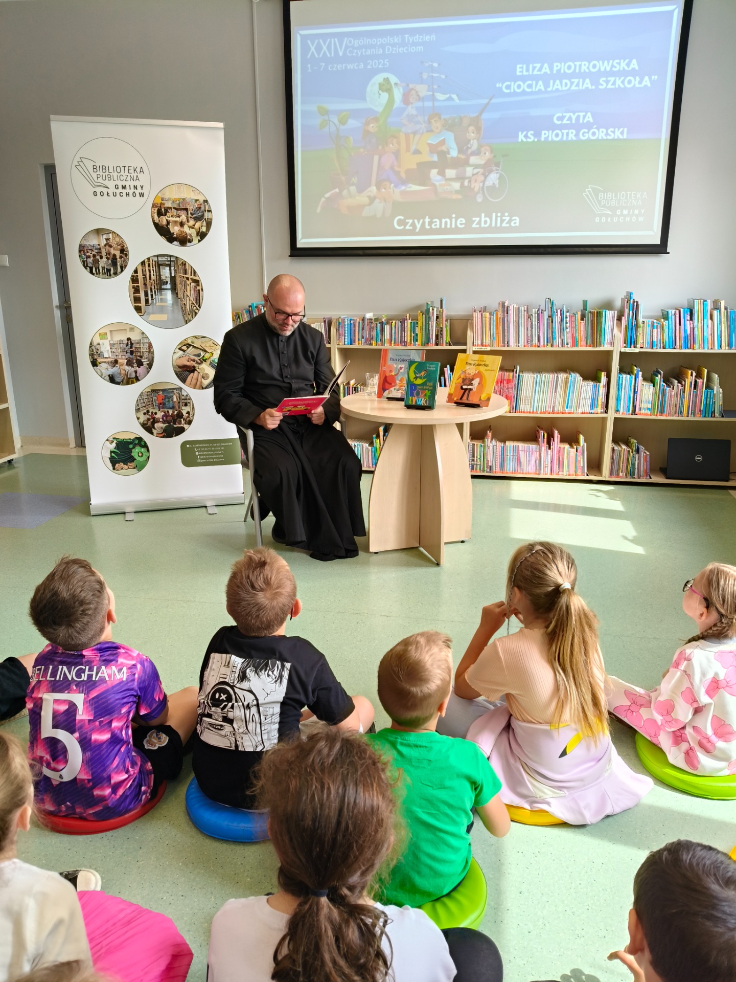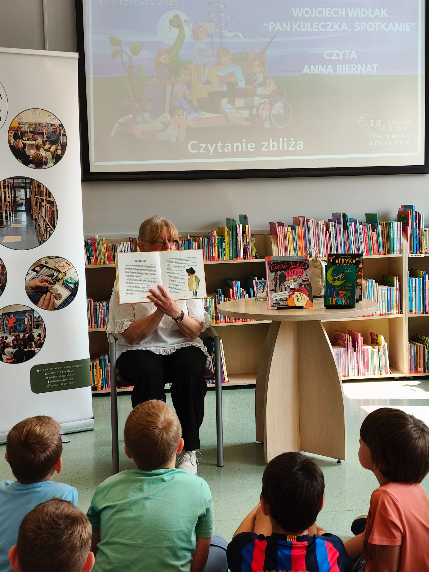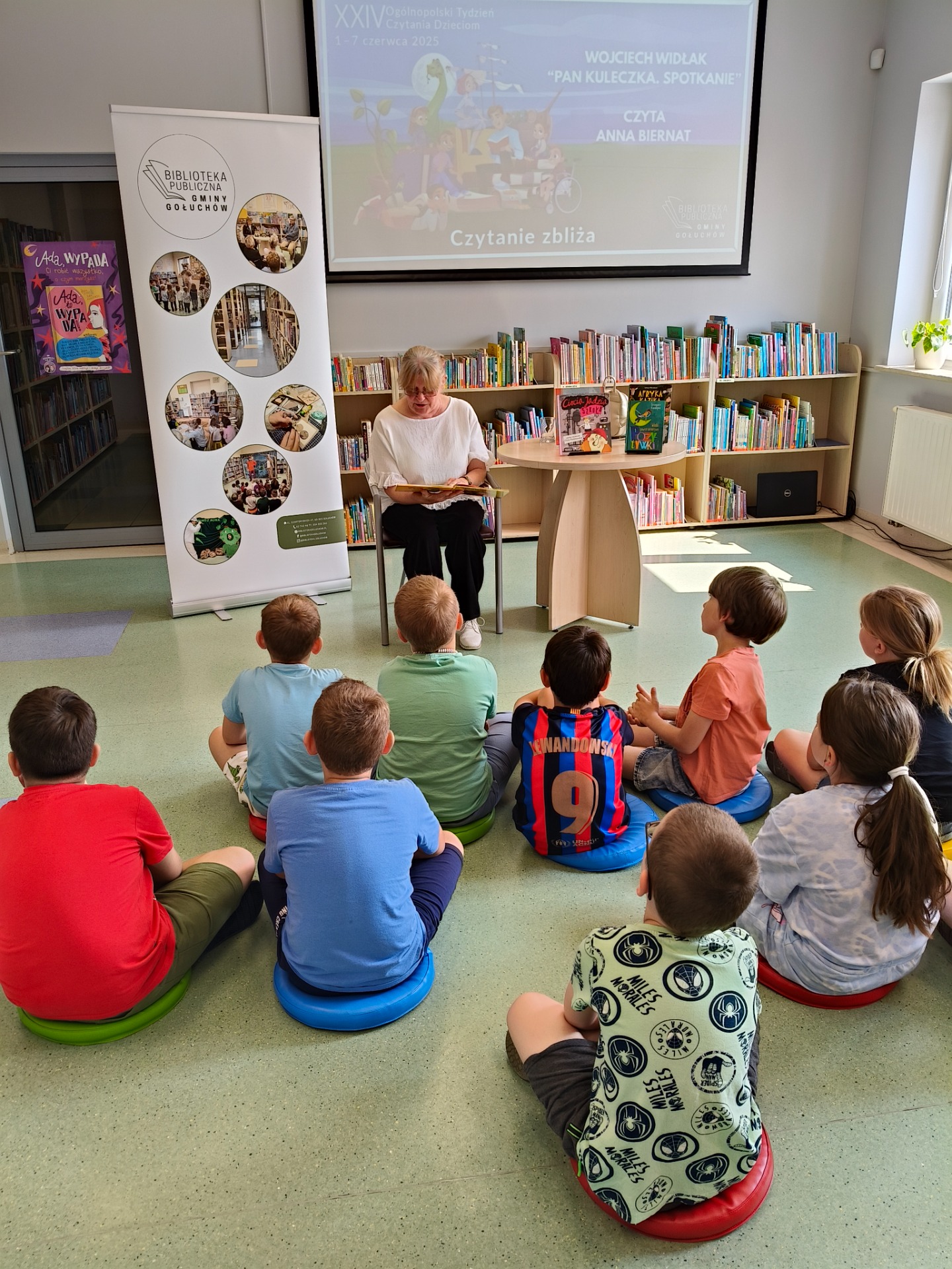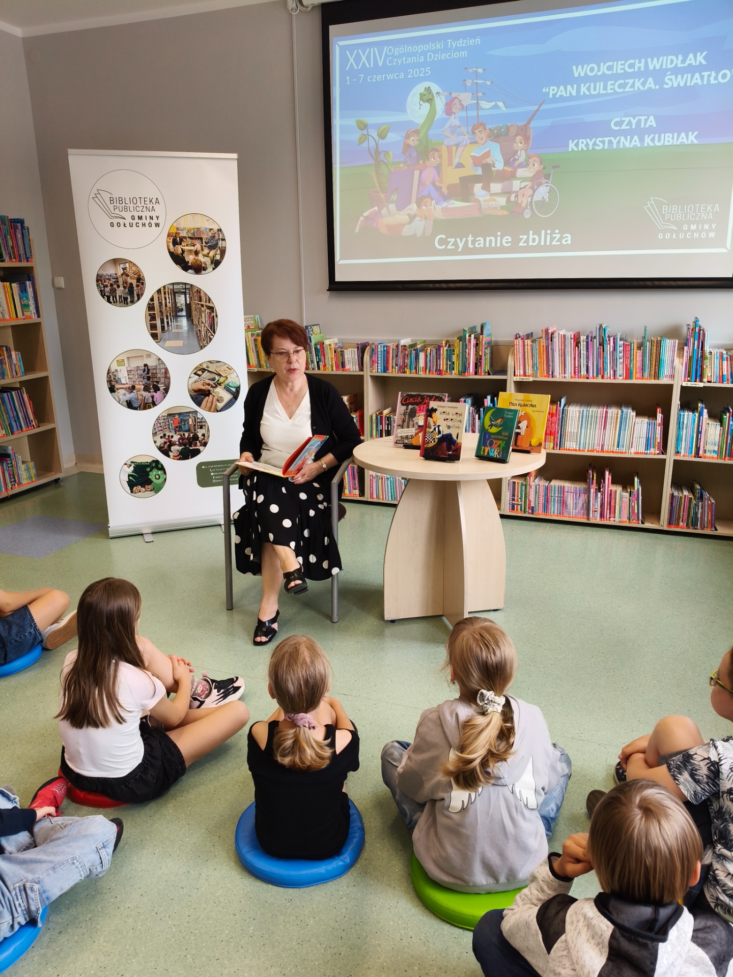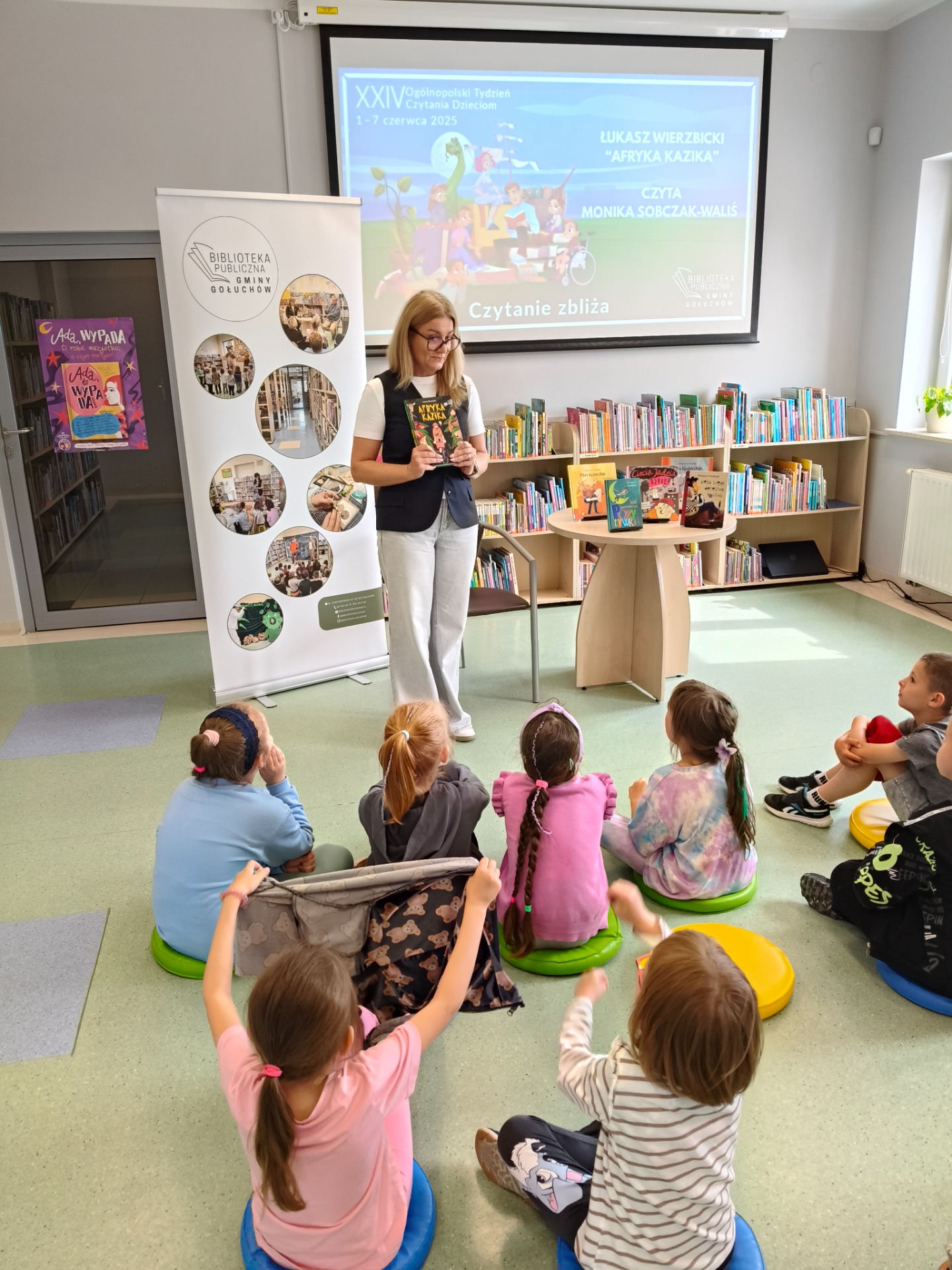 Na zakończenie tygodnia dzieci wysłuchały fragmentów książki „Afryka Kazika” Łukasza Wierzbickiego. Lektorką była Monika Sobczak-Waliś, dyrektor Biblioteki Publicznej Gminy Gołuchów. Opowieści o podróży przez egzotyczne kraje, pełne przygód i niezwykłych spotkań, przeniosły najmłodszych w zupełnie inny świat i pokazały, że czytanie to także sposób na odkrywanie odległych kultur.