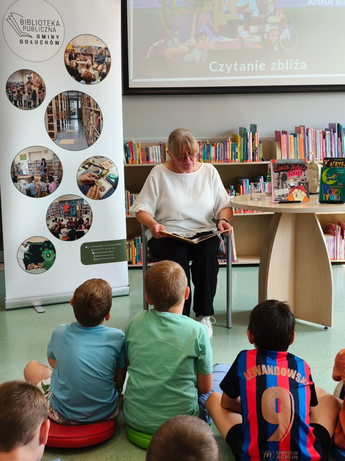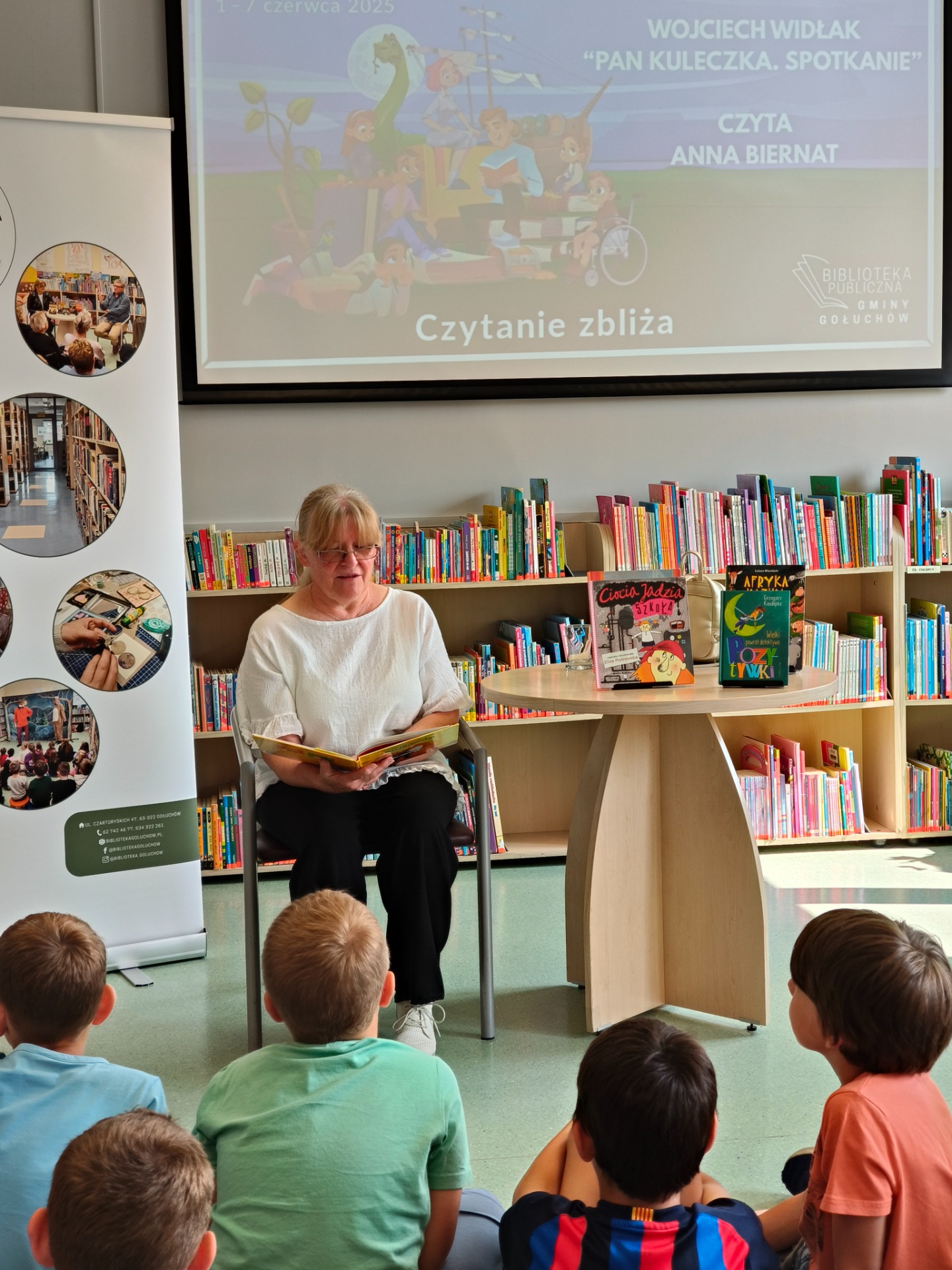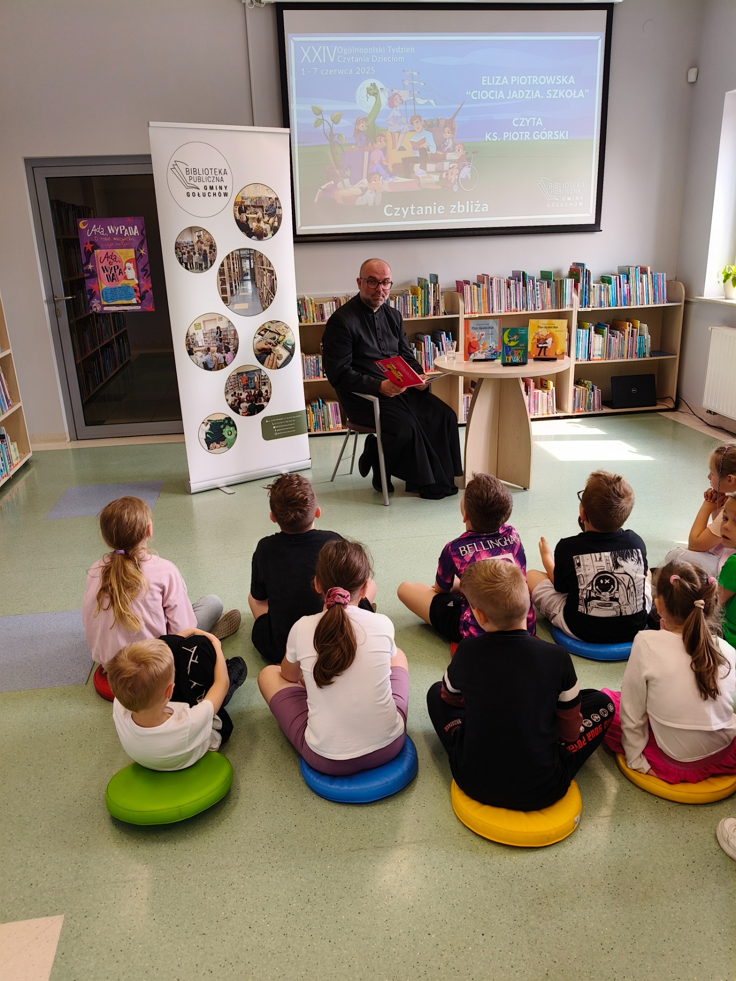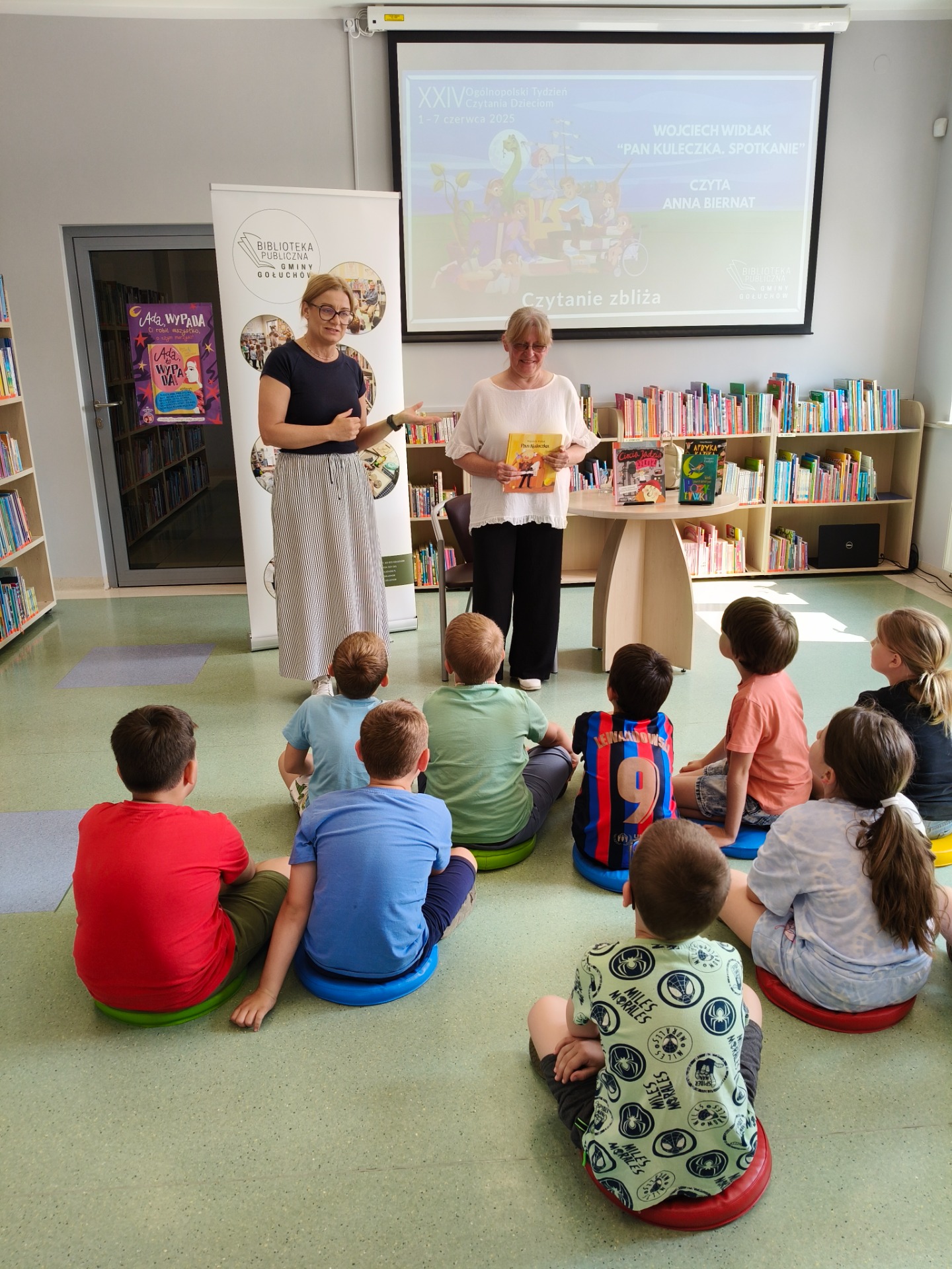 Na zakończenie tygodnia dzieci wysłuchały fragmentów książki „Afryka Kazika” Łukasza Wierzbickiego. Lektorką była Monika Sobczak-Waliś, dyrektor Biblioteki Publicznej Gminy Gołuchów. Opowieści o podróży przez egzotyczne kraje, pełne przygód i niezwykłych spotkań, przeniosły najmłodszych w zupełnie inny świat i pokazały, że czytanie to także sposób na odkrywanie odległych kultur.