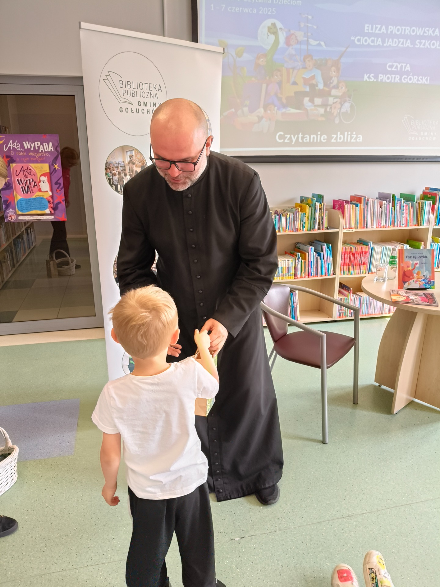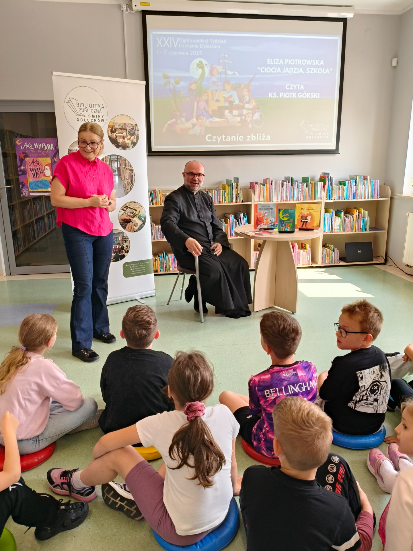 Drugiego dnia spotkaliśmy się z książką „Ciocia Jadzia. Szkoła” autorstwa Elizy Piotrowskiej. W rolę lektora wcielił się ks. Piotr Górski, kustosz Sanktuarium w Tursku. Barwna i zabawna opowieść o szkolnych przygodach Cioci Jadzi wzbudziła wśród najmłodszych wiele śmiechu i skłoniła do rozmów o tym, jak wygląda ich własne życie szkolne.