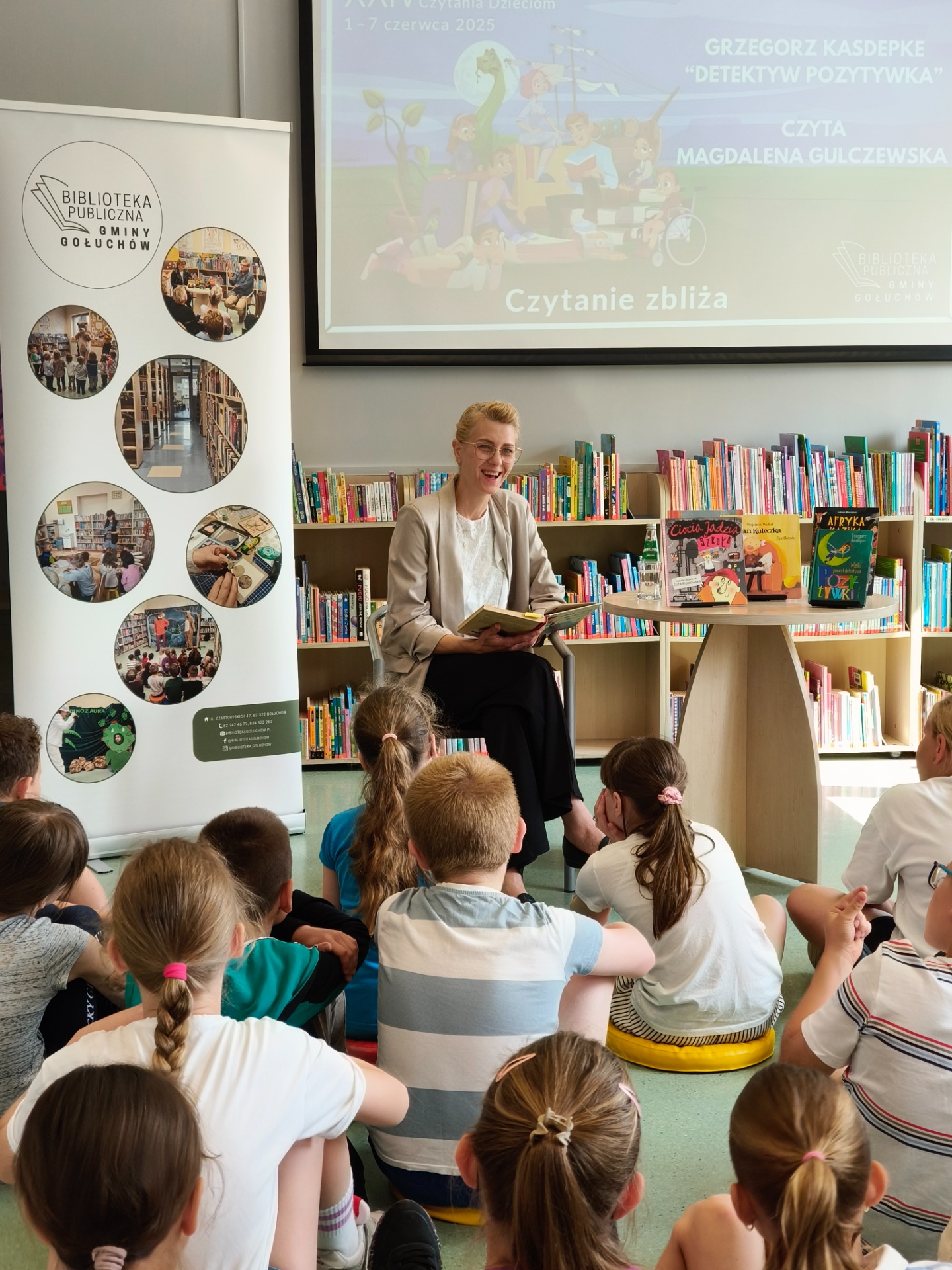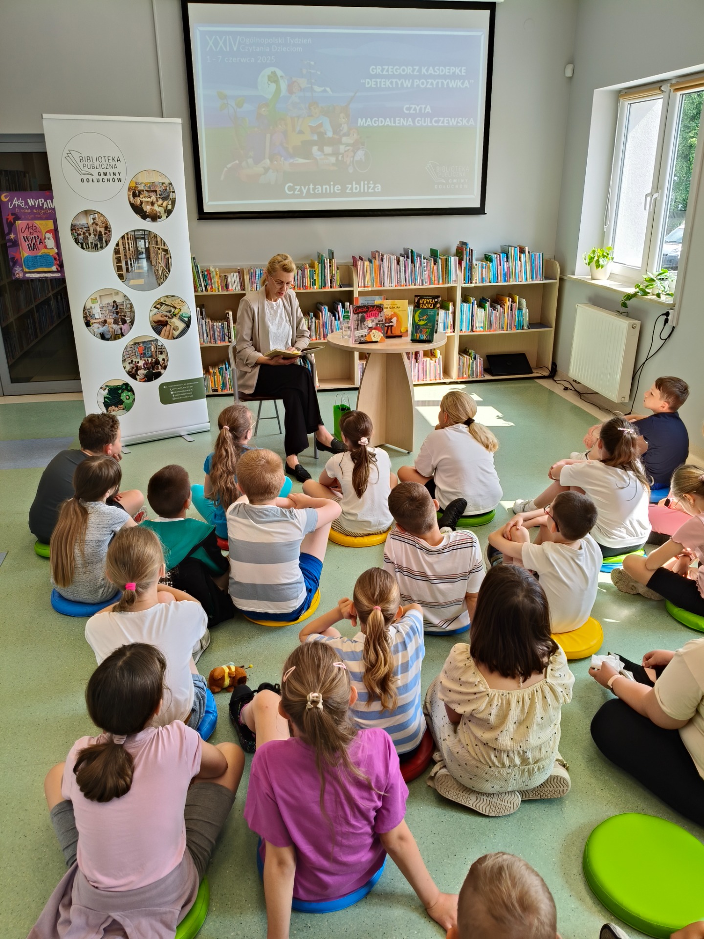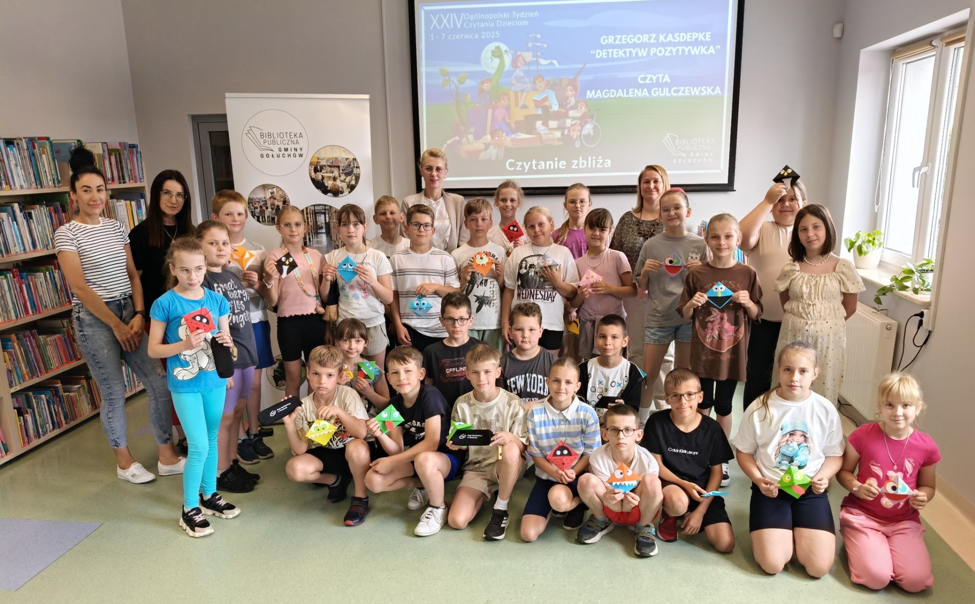 Czwartego dnia dzieci poznały przygody sympatycznego bohatera książki Grzegorza Kasdepke „Detektyw Pozytywka”. Czytanie poprowadziła Magdalena Gulczewska, dyrektor Oddziału Banku Spółdzielczego w Gołuchowie. Historia o nietypowym detektywie, rozwiązującym zagadki z humorem i sprytem, wywołała wśród uczniów ogromne zainteresowanie i zachęciła do dalszego sięgania po książki z tej serii.