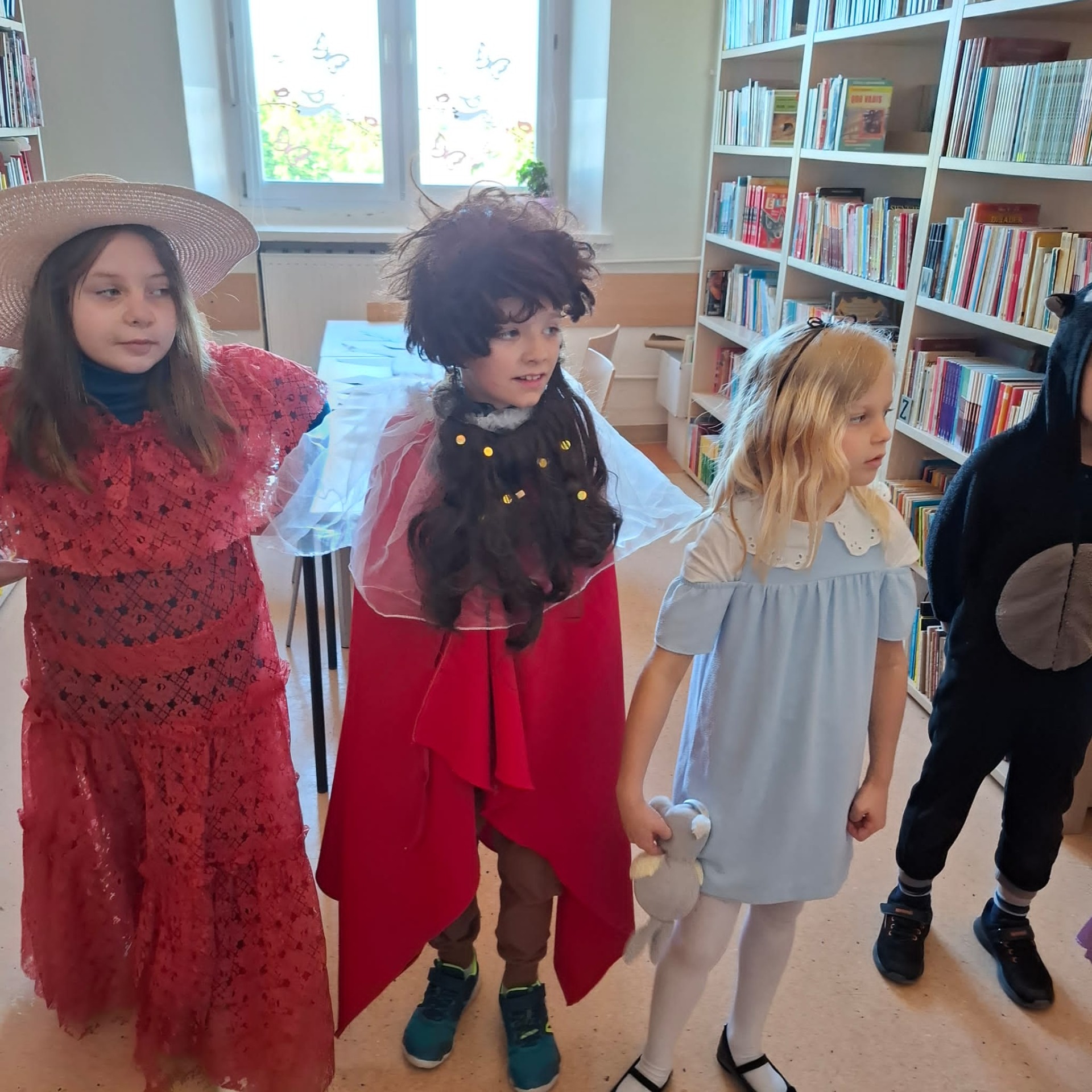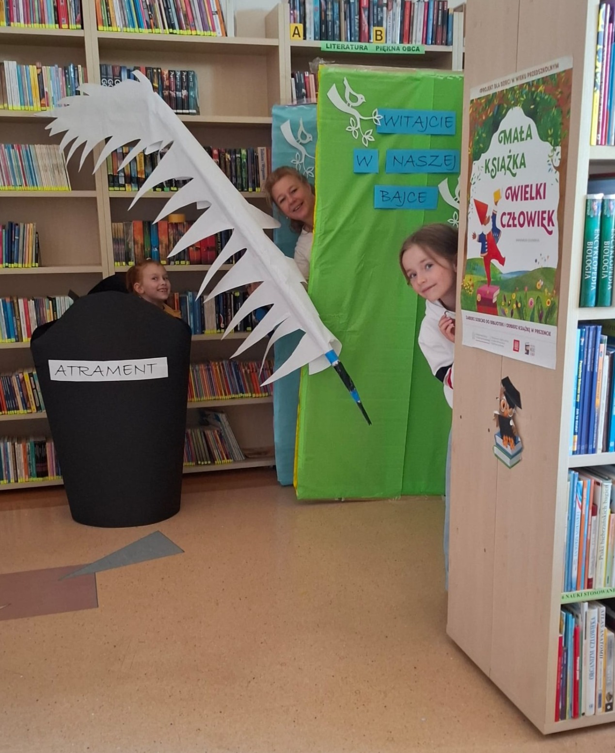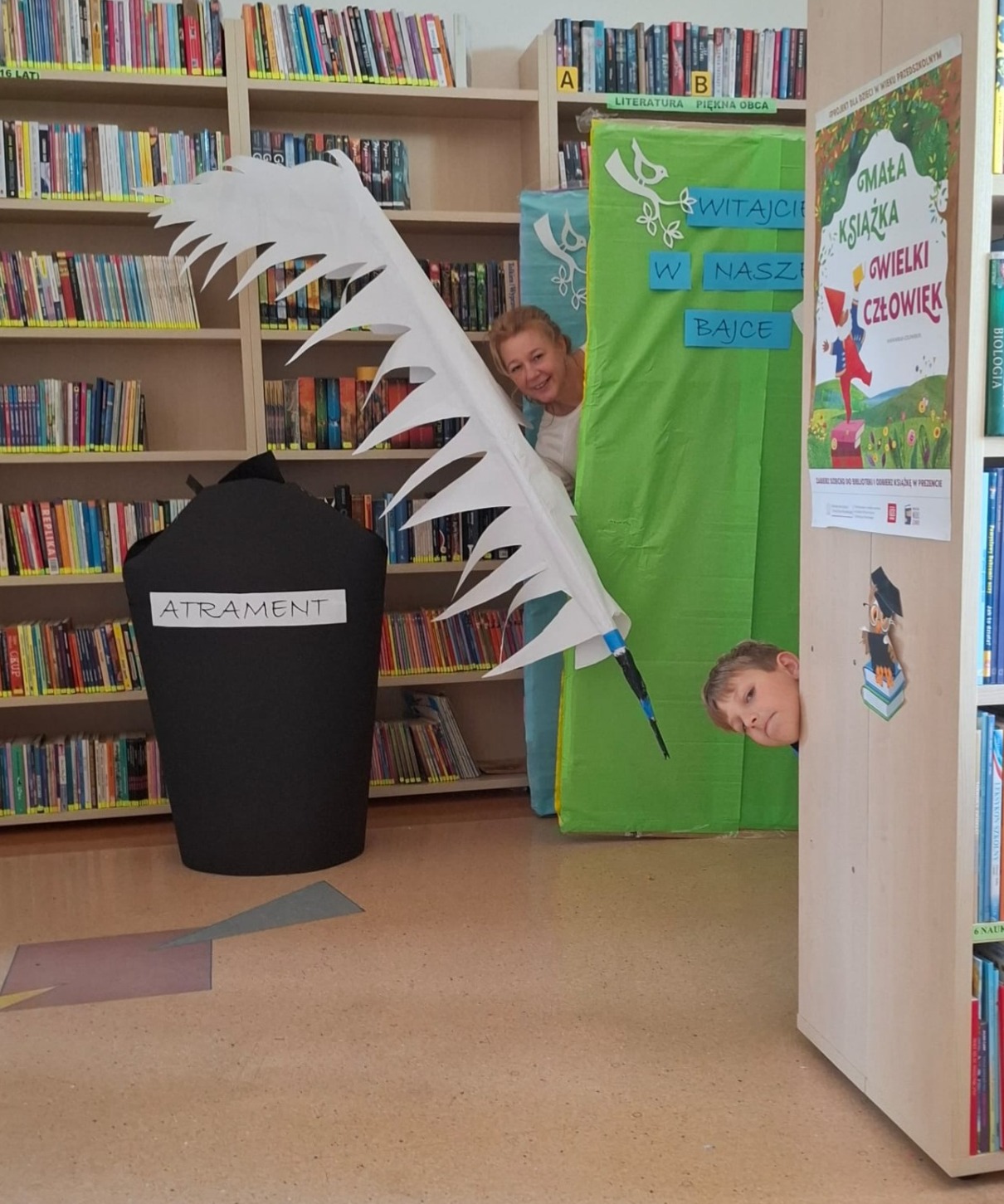 Pierwszym z nich było spotkanie z uczniami klasy 2b z Zespołu Szkolno-Przedszkolnego w Kościelnej Wsi. Pod okiem bibliotekarki Ani dzieci wspólnie stworzyły bajkę w ogromnej książce – pełnej wymyślonych bohaterów, niezwykłych przygód i fantastycznych zdarzeń. Do zabawy chętnie dołączyli także inni uczniowie, dzięki czemu powstała prawdziwa, wspólna opowieść, będąca efektem dziecięcej wyobraźni i współpracy.