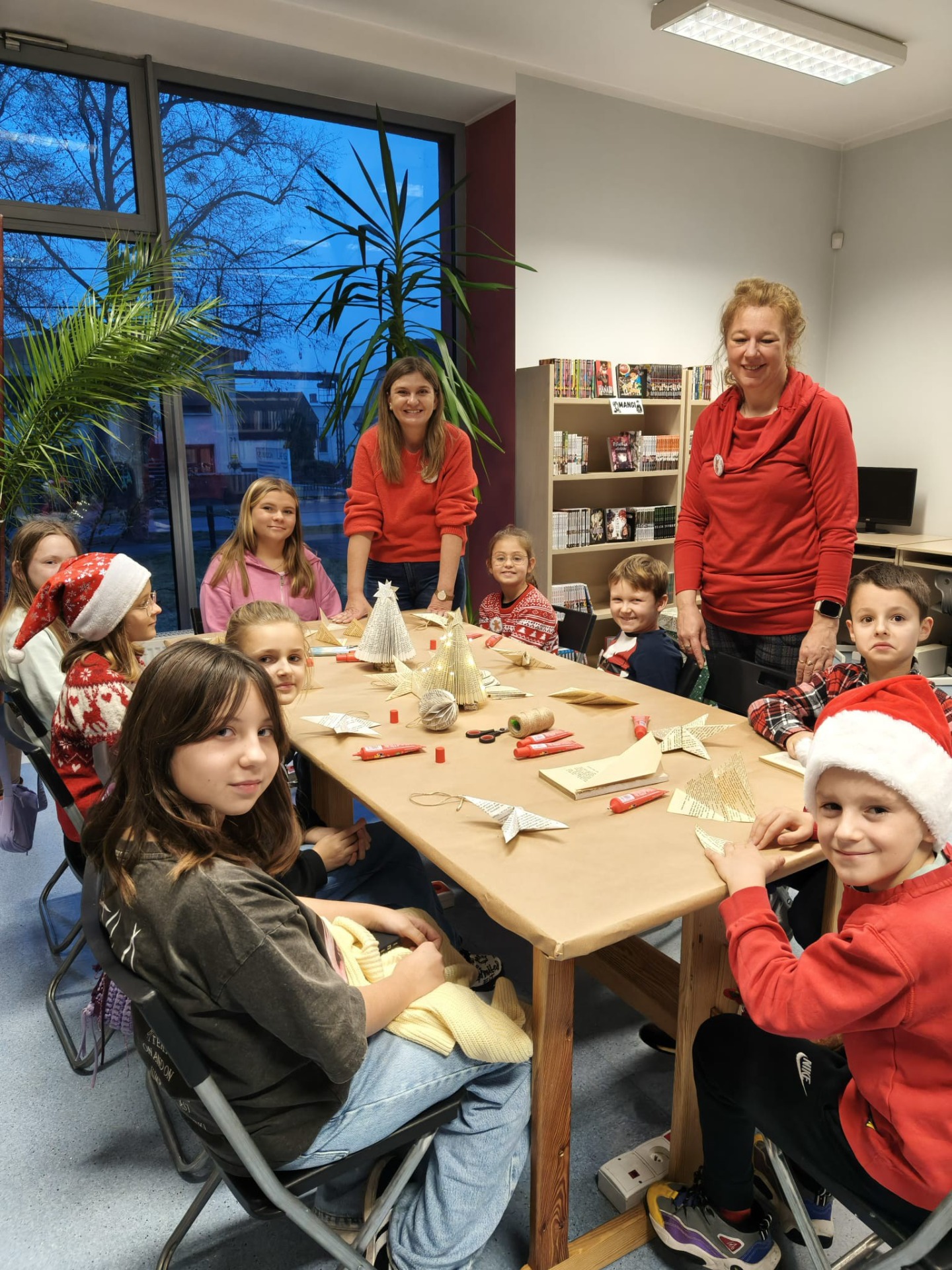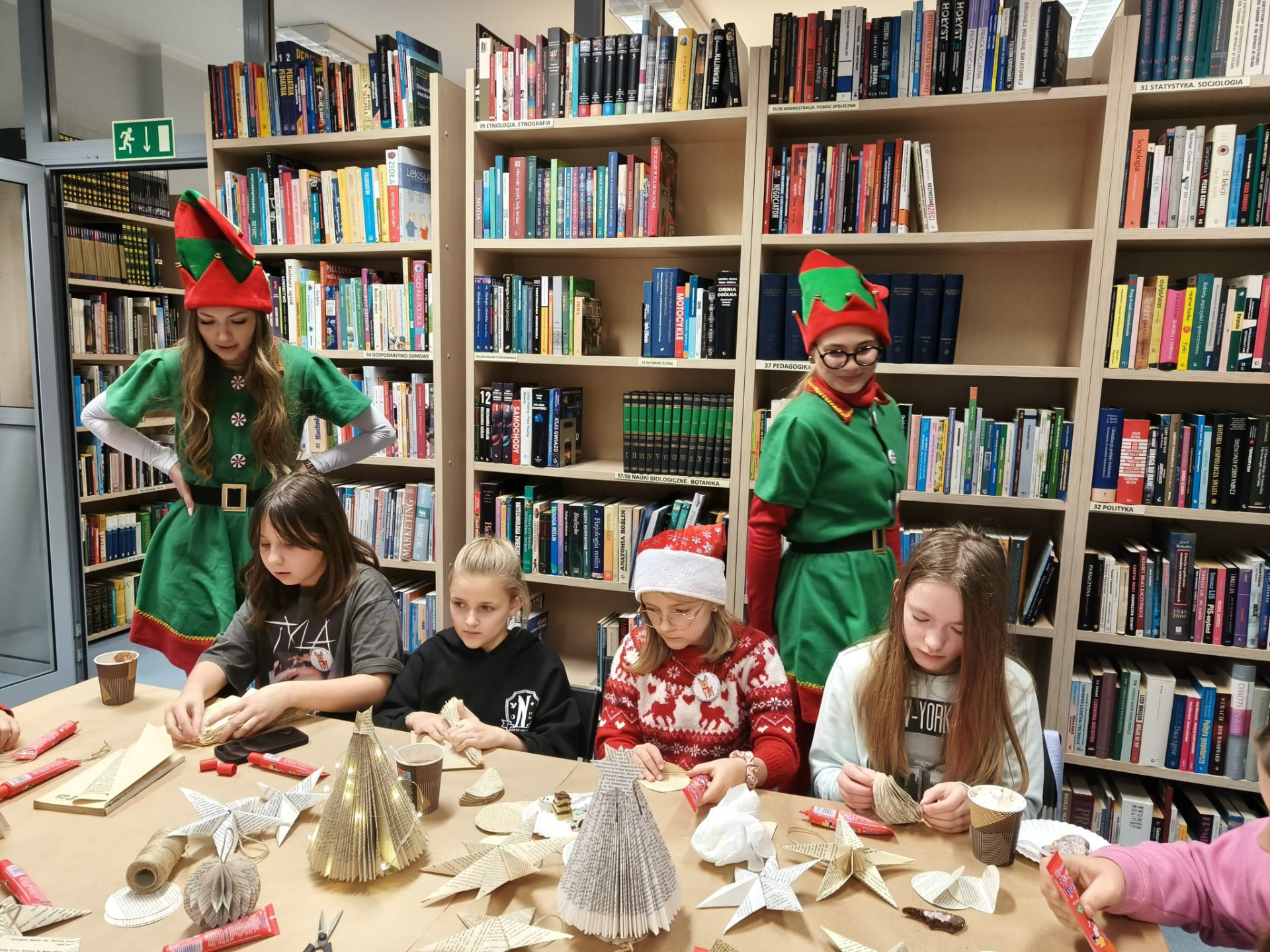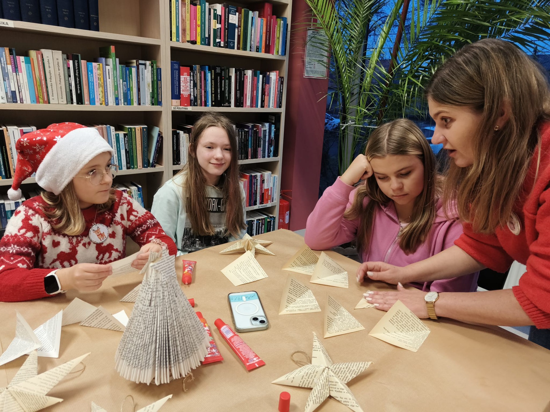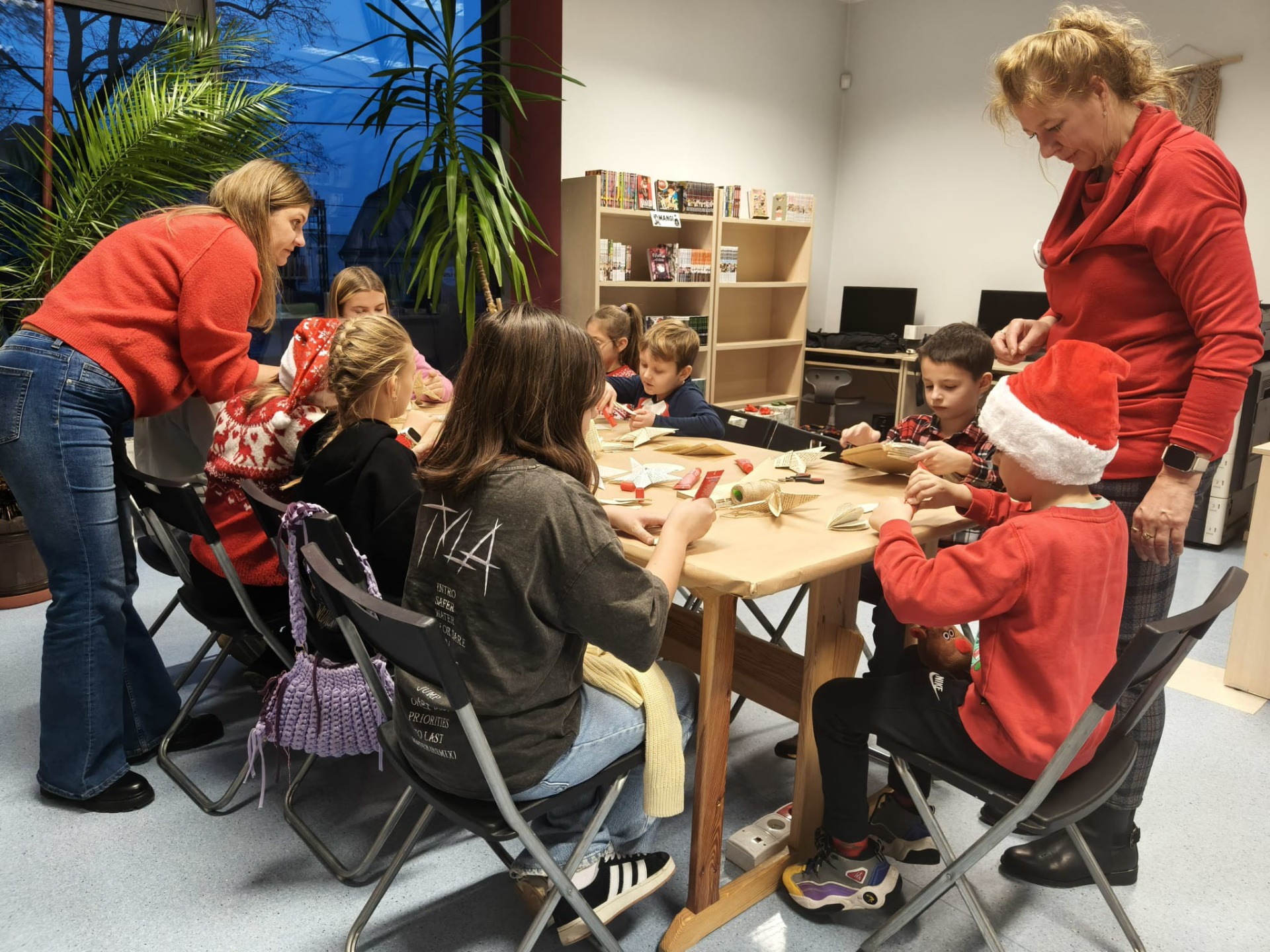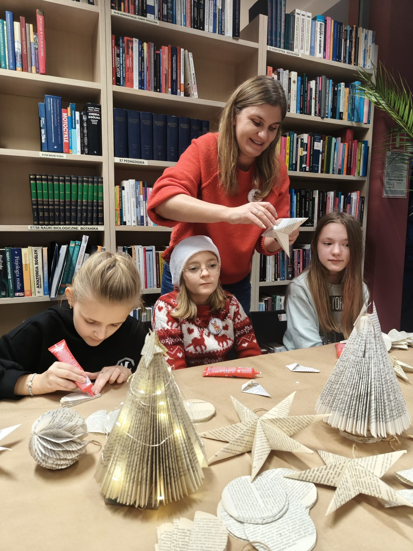 Zanim drzewko rozbłysło ciepłym światłem lampek, należało je starannie udekorować. Zadanie to przypadło pierwszej grupie warsztatowiczów, która wspólnie z animatorami z Uciechowa przygotowywała świąteczne ozdoby. W tym samym czasie druga grupa dzieci tworzyła dekoracje metodą book folding art, polegającą na precyzyjnym składaniu stron książek w finezyjne wzory – oczywiście i w tym przypadku królowały motywy świąteczne.