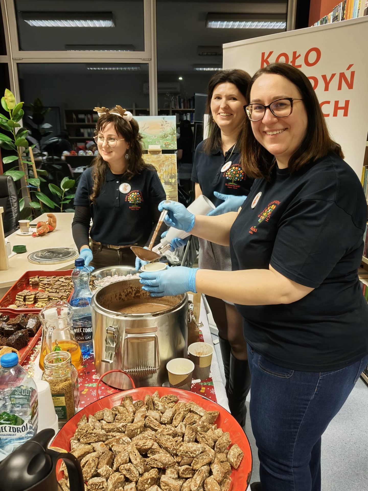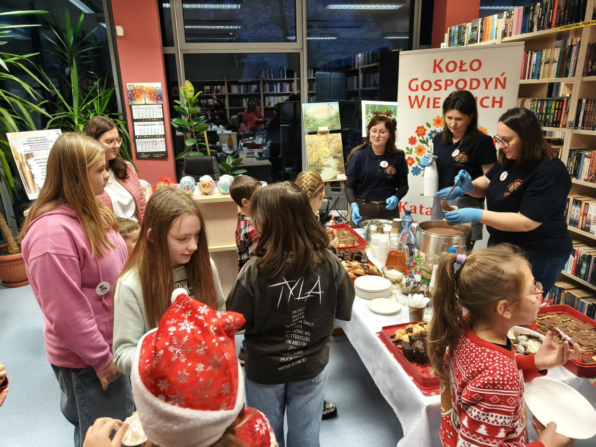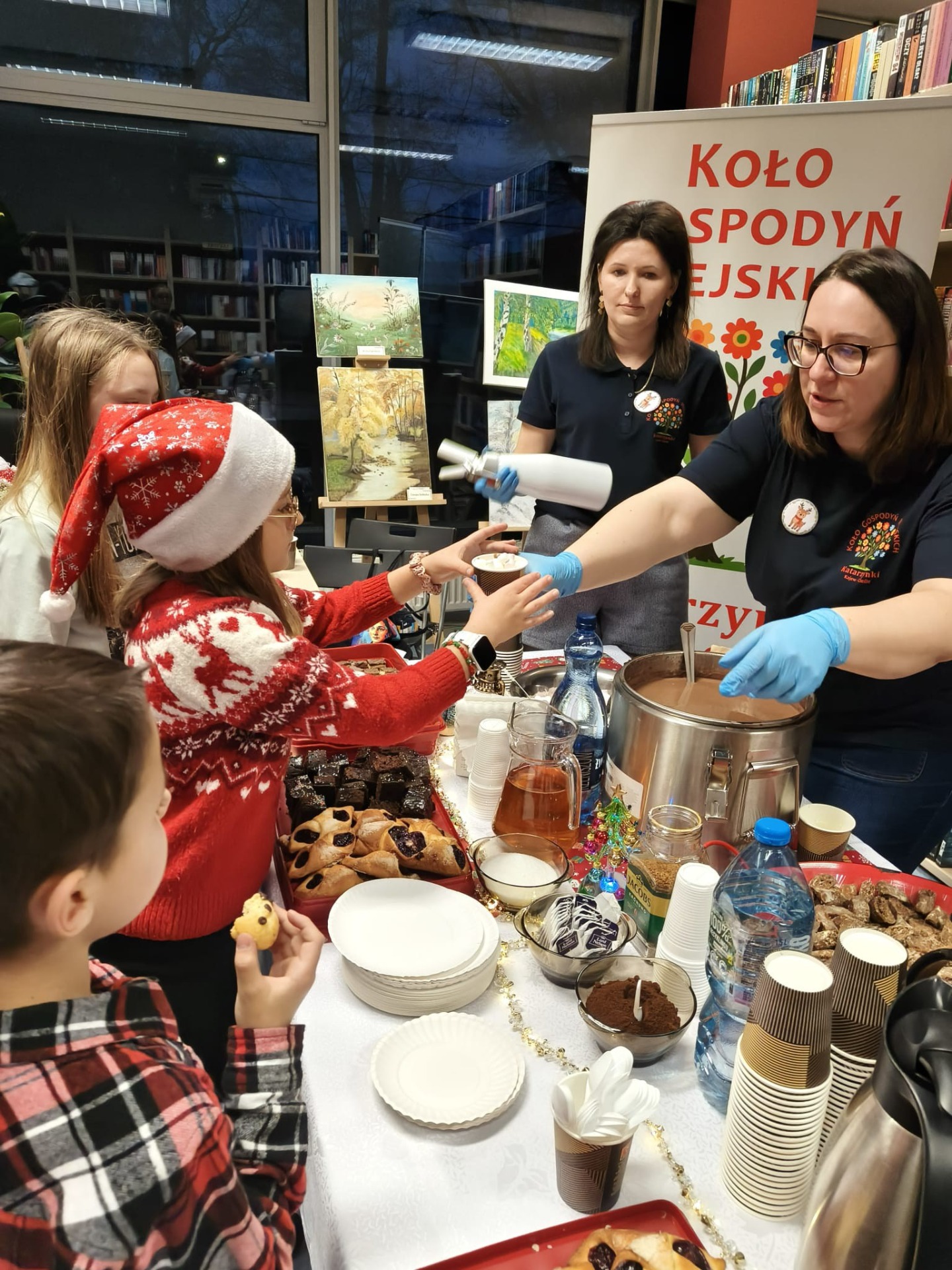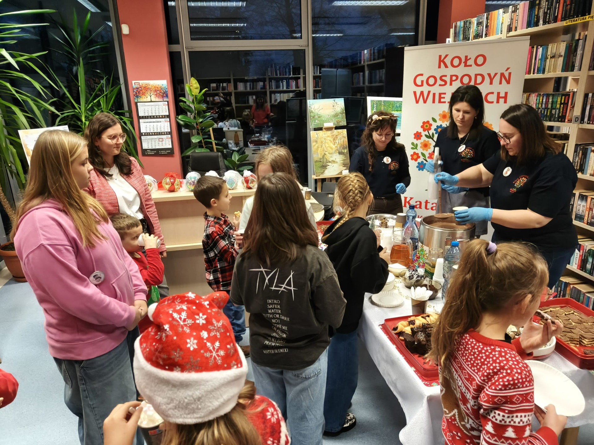 Słodki poczęstunek dla dzieci i rodziców przygotowały tym razem Panie z KGW „Katarzynki” Kajew-Cieśle. Na stołach królowały pierniczki, rogaliki z powidłami oraz muffinki, jednak najdłuższa kolejka ustawiła się do gorącej czekolady, która – jak na święta przystało – serwowana była z bitą śmietaną.
