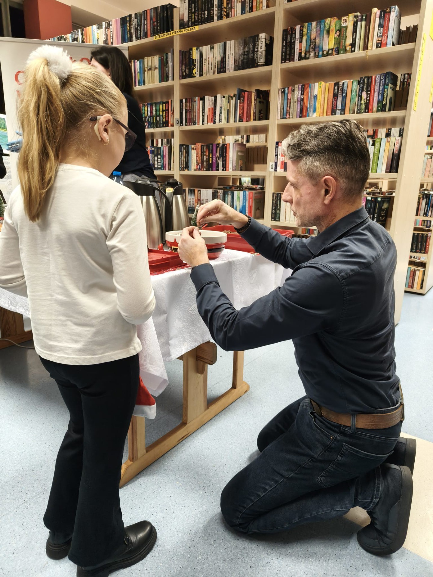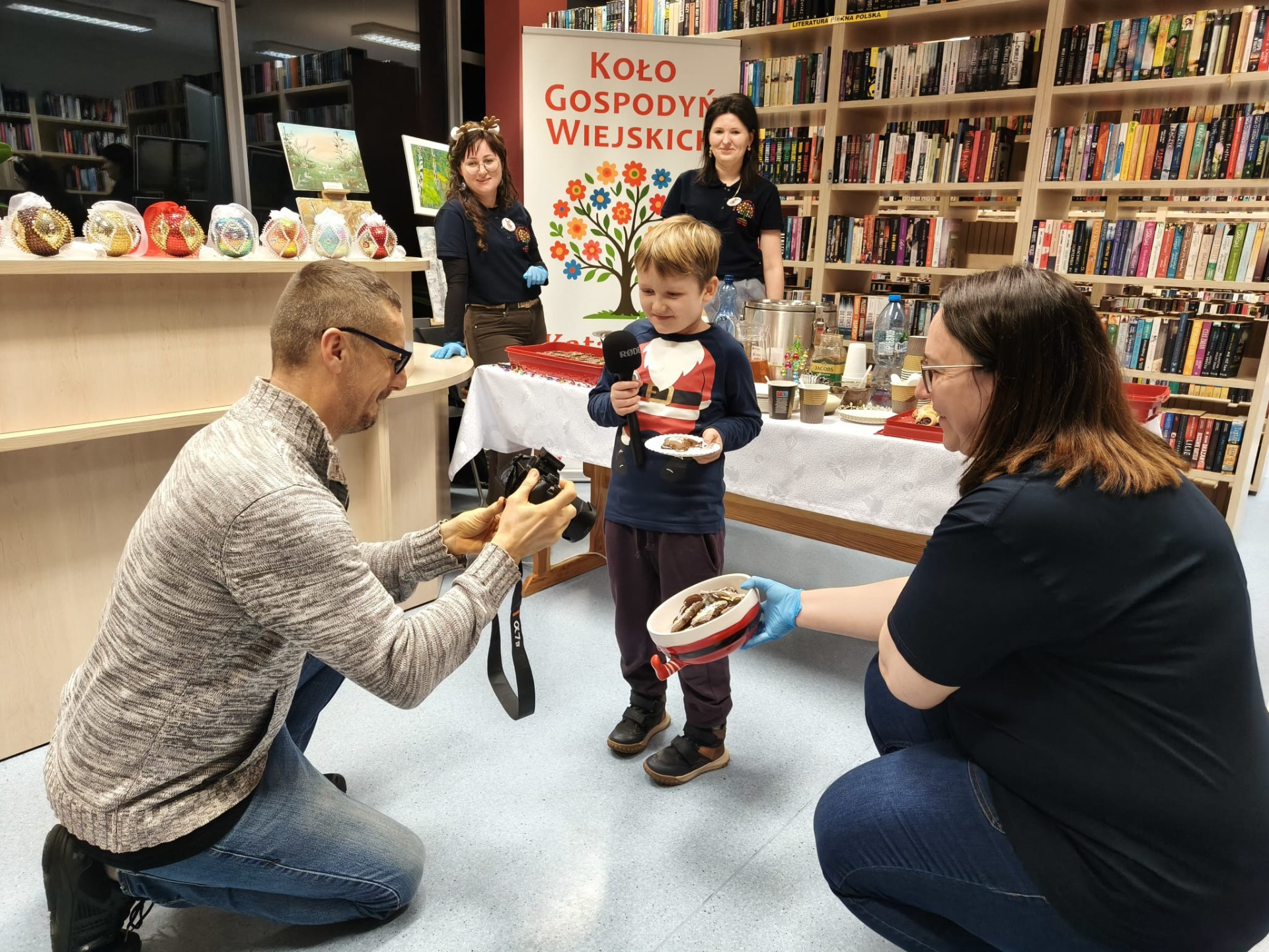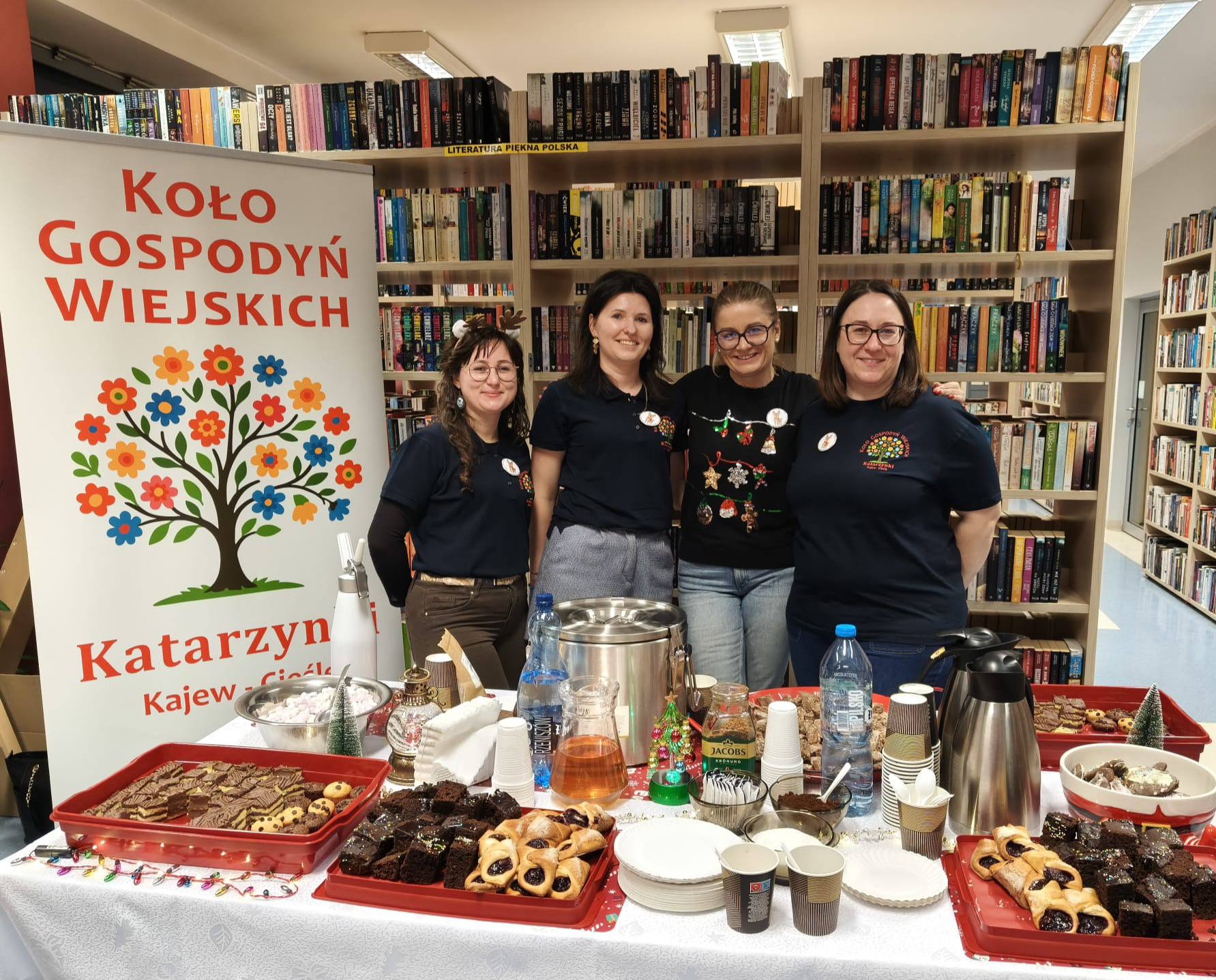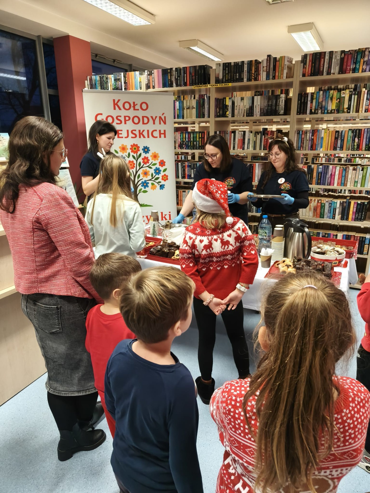 Słodki poczęstunek dla dzieci i rodziców przygotowały tym razem Panie z KGW „Katarzynki” Kajew-Cieśle. Na stołach królowały pierniczki, rogaliki z powidłami oraz muffinki, jednak najdłuższa kolejka ustawiła się do gorącej czekolady, która – jak na święta przystało – serwowana była z bitą śmietaną.