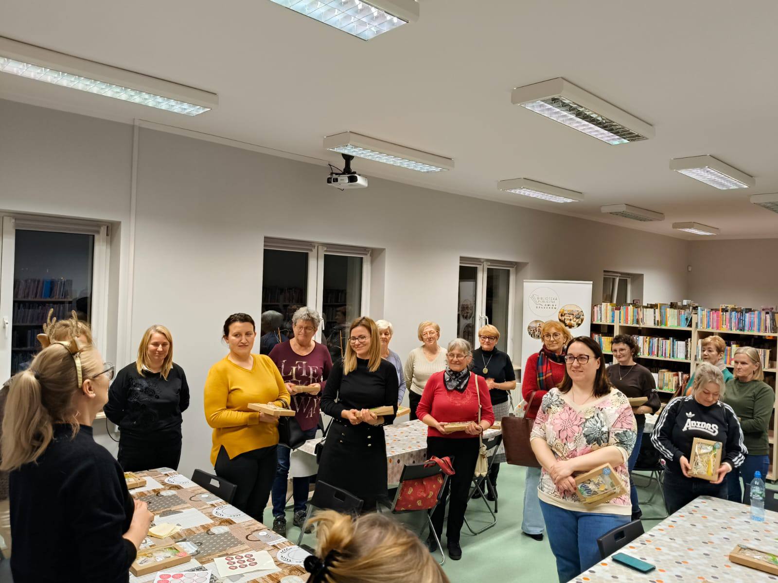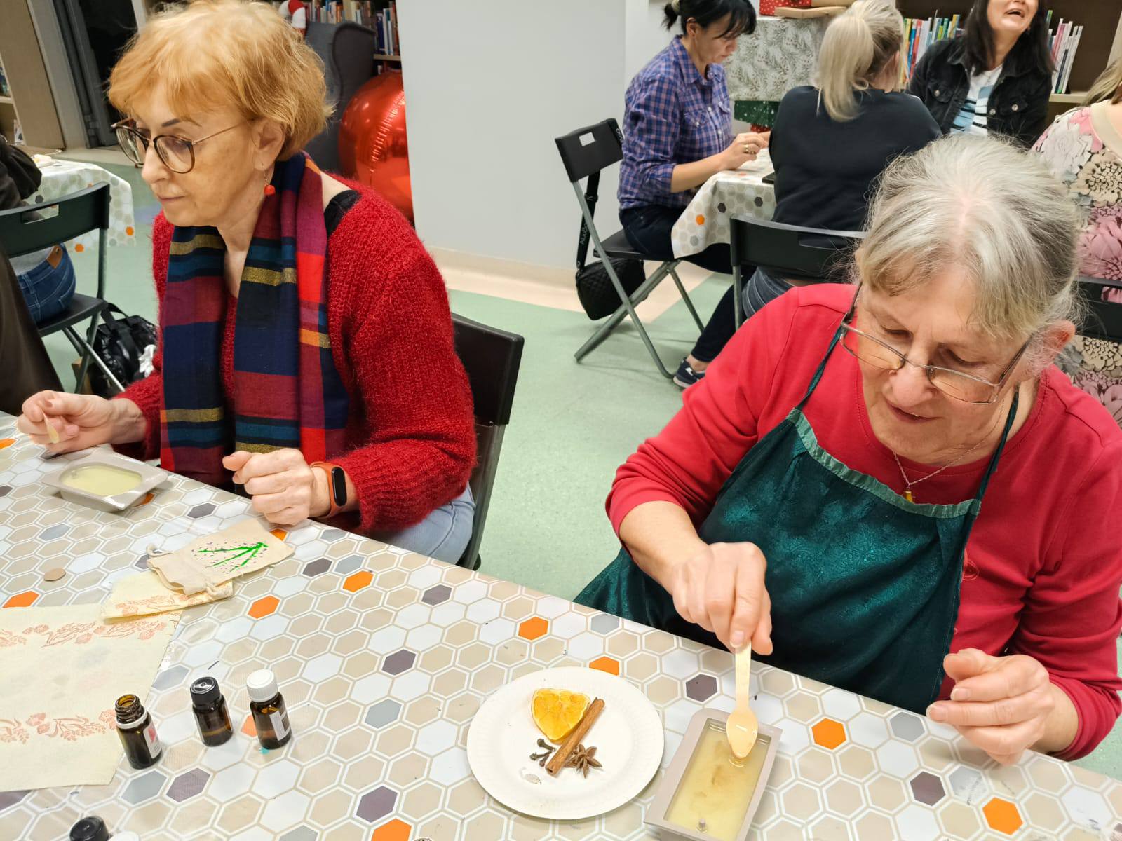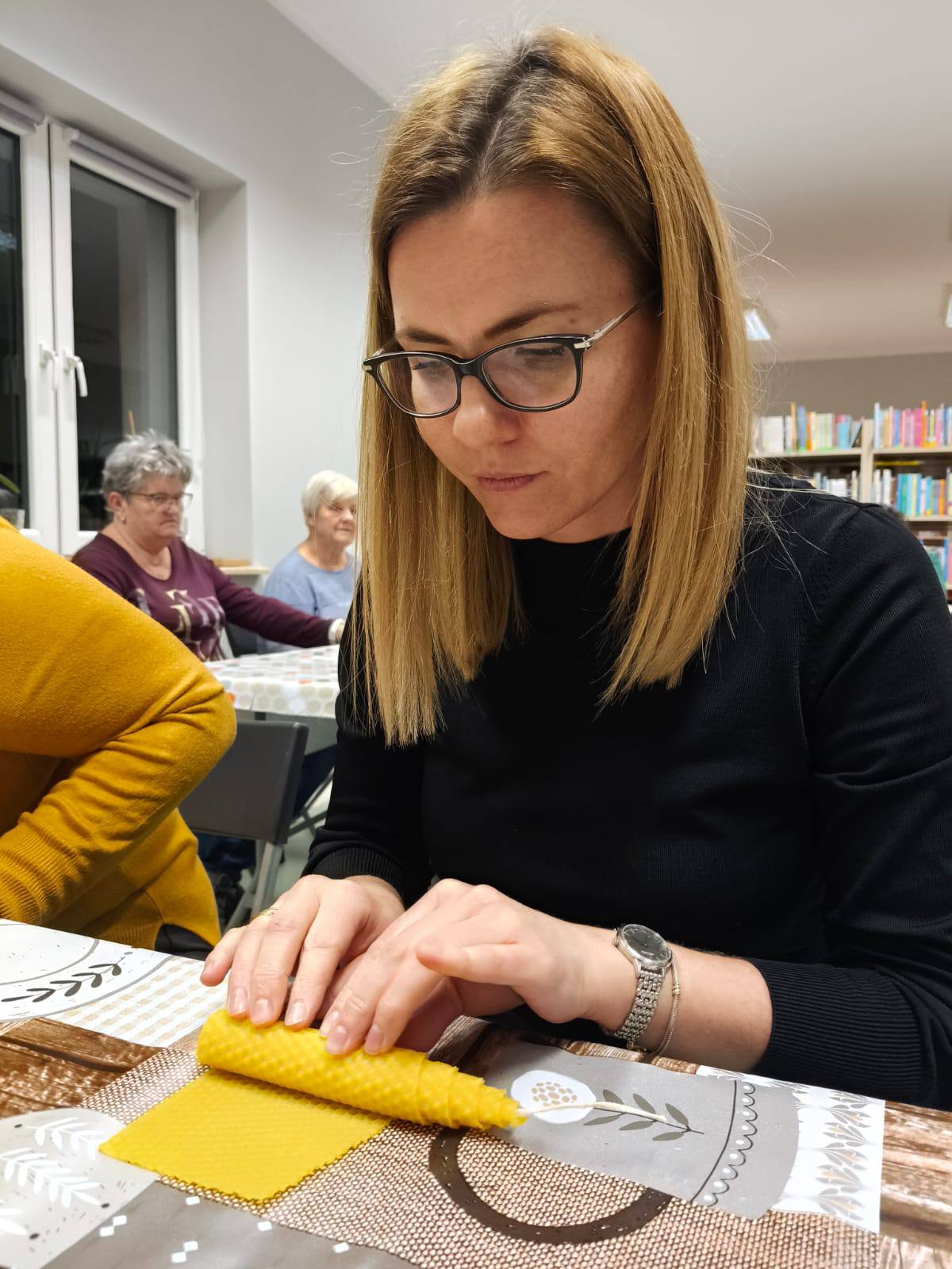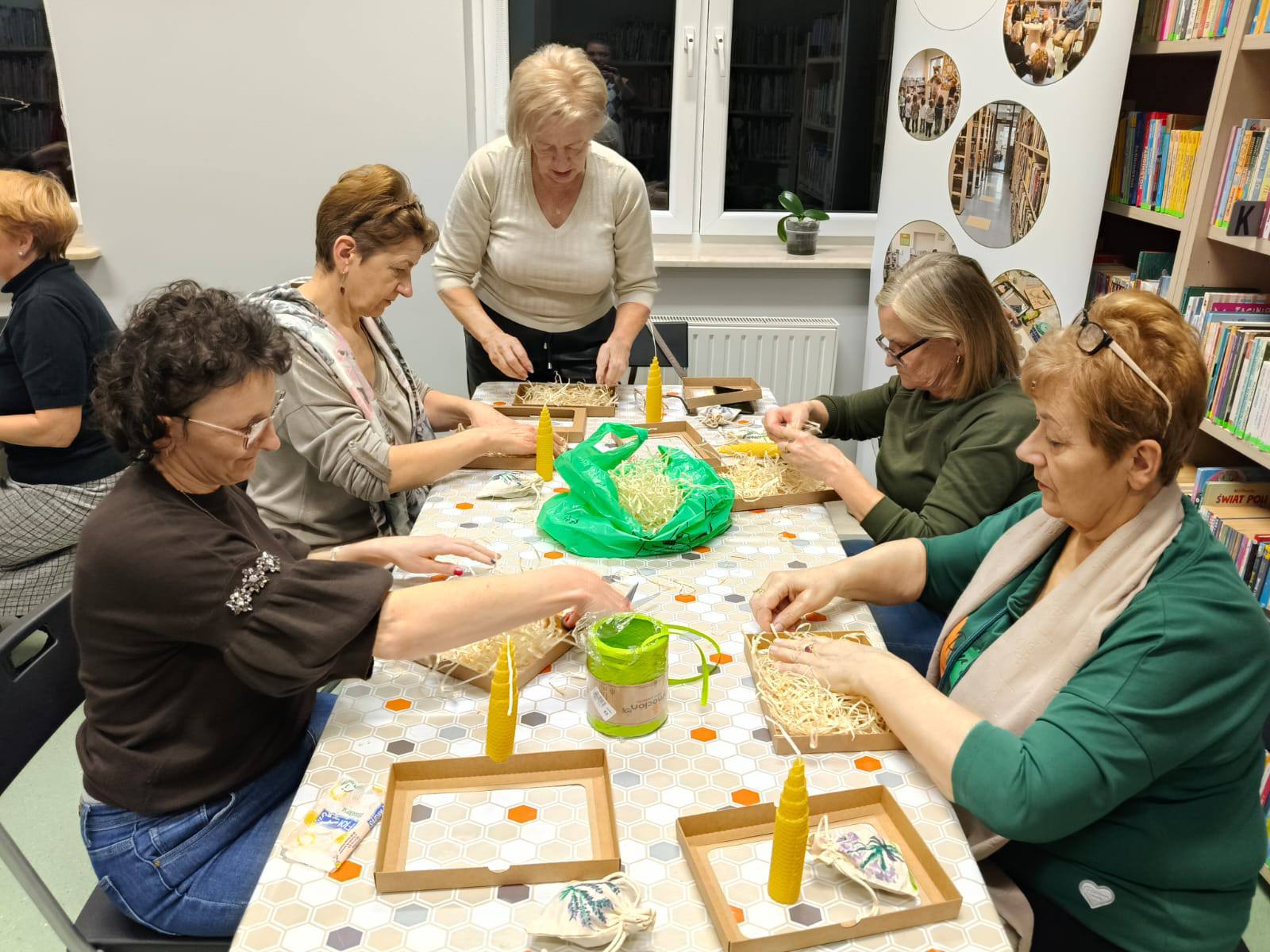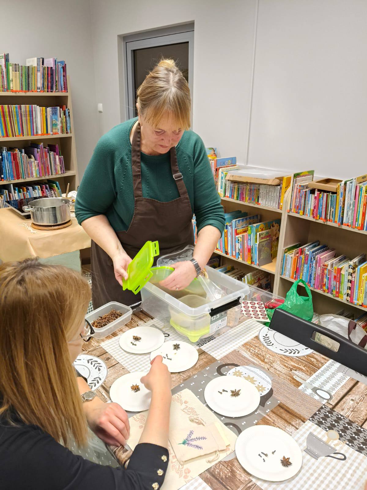 Spotkanie rozpoczęło się od tworzenia florenckich tabliczek zapachowych z wosku sojowego, który obok pszczelego uważany jest za jeden z najzdrowszych. Każda uczestniczka mogła skomponować swoją mieszankę i choć wybór był naprawdę imponujący w grudniowym klimacie dominowały zapachy pomarańczy, cynamonu oraz goździków, które wypełniły bibliotekę aromatem świąt. Następnie przyszedł czas na działania plastyczne. Panie ozdabiały materiałowe woreczki, które później wypełniły suszoną lawendą oraz olejkami, tworząc pachnące i efektowne upominki. Kolejnym etapem warsztatów było wykonanie świec z węzy pszczelej, cenionej za swoje właściwości i delikatny, miodowy zapach. Na zakończenie wszystkie prace zostały starannie zapakowane w kartoniki, by stać się wyjątkowymi, bo wykonanymi własnoręcznie, prezentami świątecznymi. W trakcie spotkania Hanna Wojtyczka opowiadała mnóstwo ciekawostek na temat właściwości wosku oraz ziół.