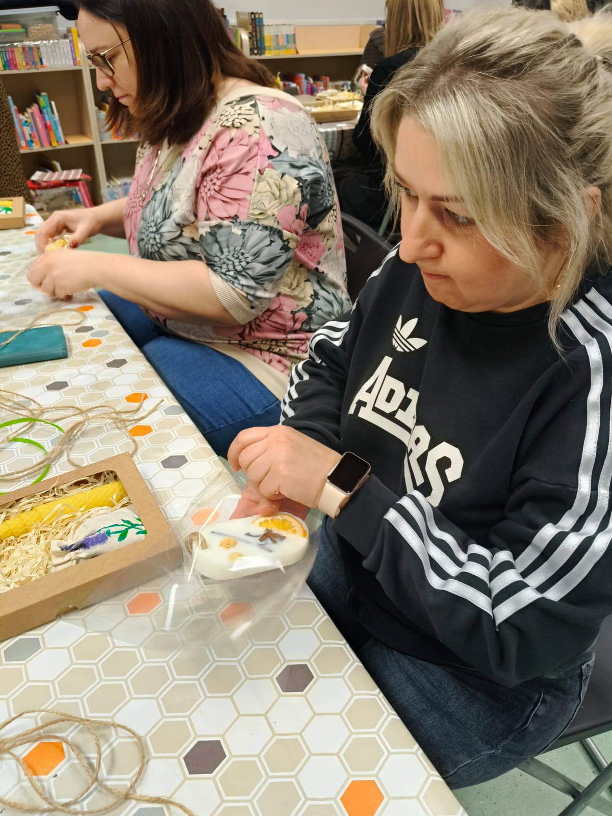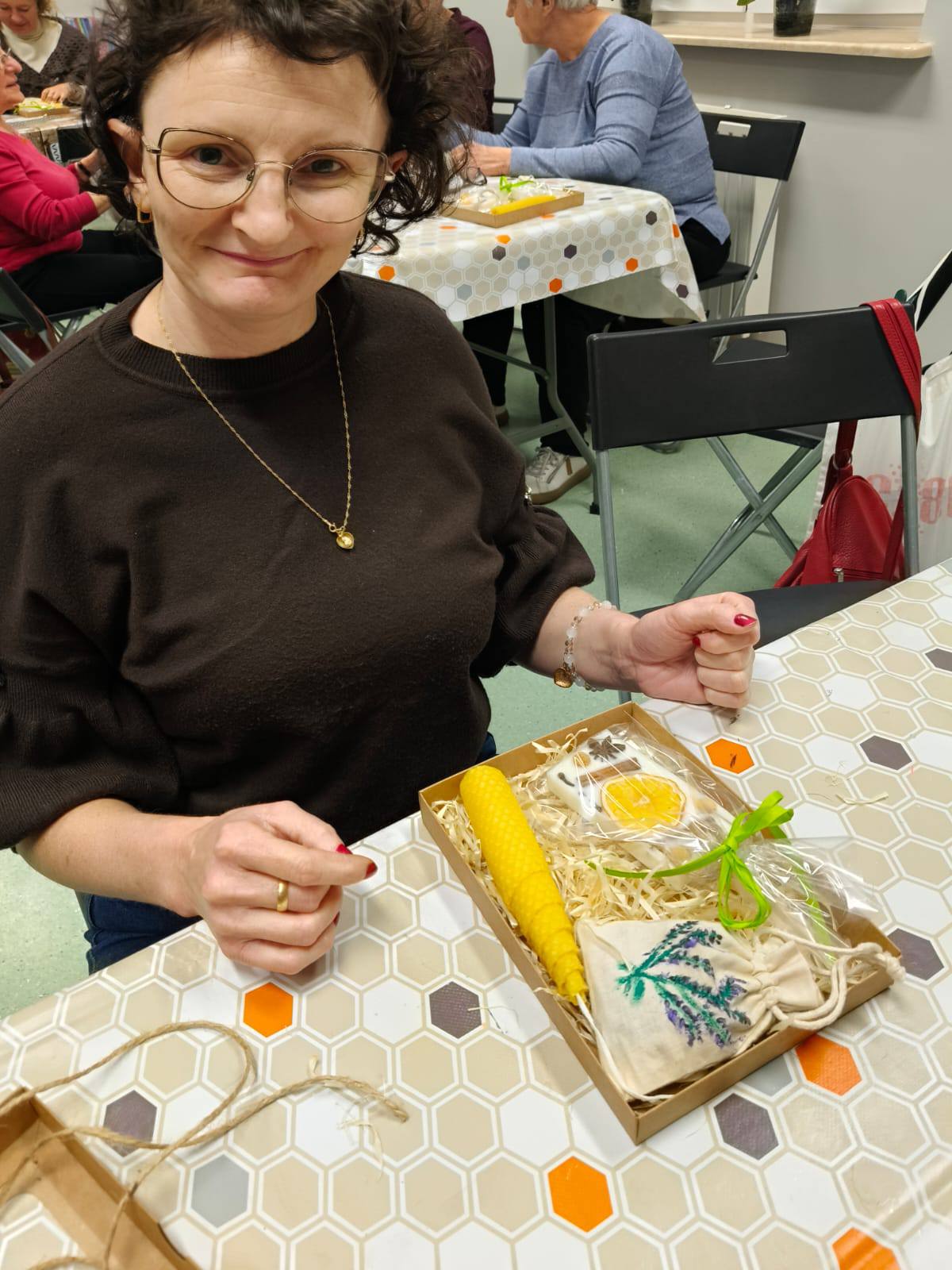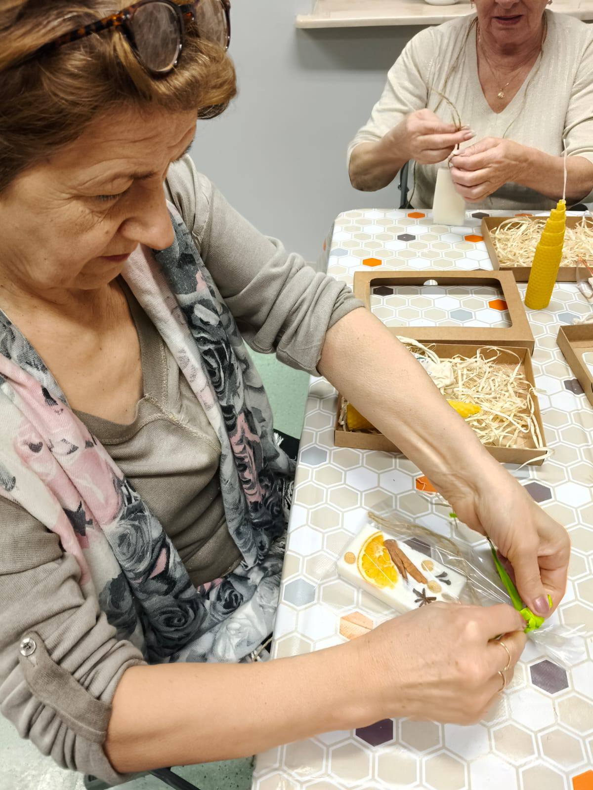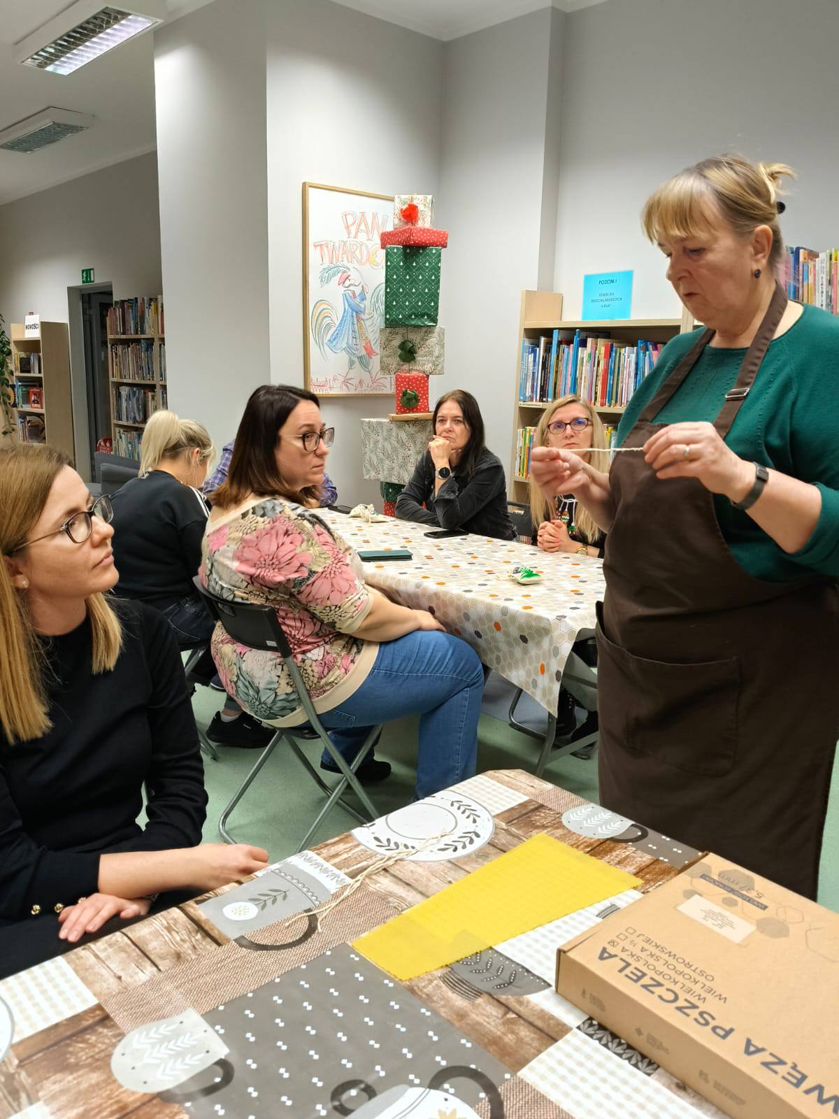 Spotkanie rozpoczęło się od tworzenia florenckich tabliczek zapachowych z wosku sojowego, który obok pszczelego uważany jest za jeden z najzdrowszych. Każda uczestniczka mogła skomponować swoją mieszankę i choć wybór był naprawdę imponujący w grudniowym klimacie dominowały zapachy pomarańczy, cynamonu oraz goździków, które wypełniły bibliotekę aromatem świąt. Następnie przyszedł czas na działania plastyczne. Panie ozdabiały materiałowe woreczki, które później wypełniły suszoną lawendą oraz olejkami, tworząc pachnące i efektowne upominki. Kolejnym etapem warsztatów było wykonanie świec z węzy pszczelej, cenionej za swoje właściwości i delikatny, miodowy zapach. Na zakończenie wszystkie prace zostały starannie zapakowane w kartoniki, by stać się wyjątkowymi, bo wykonanymi własnoręcznie, prezentami świątecznymi. W trakcie spotkania Hanna Wojtyczka opowiadała mnóstwo ciekawostek na temat właściwości wosku oraz ziół.