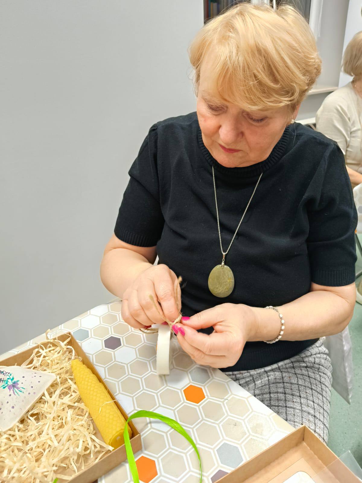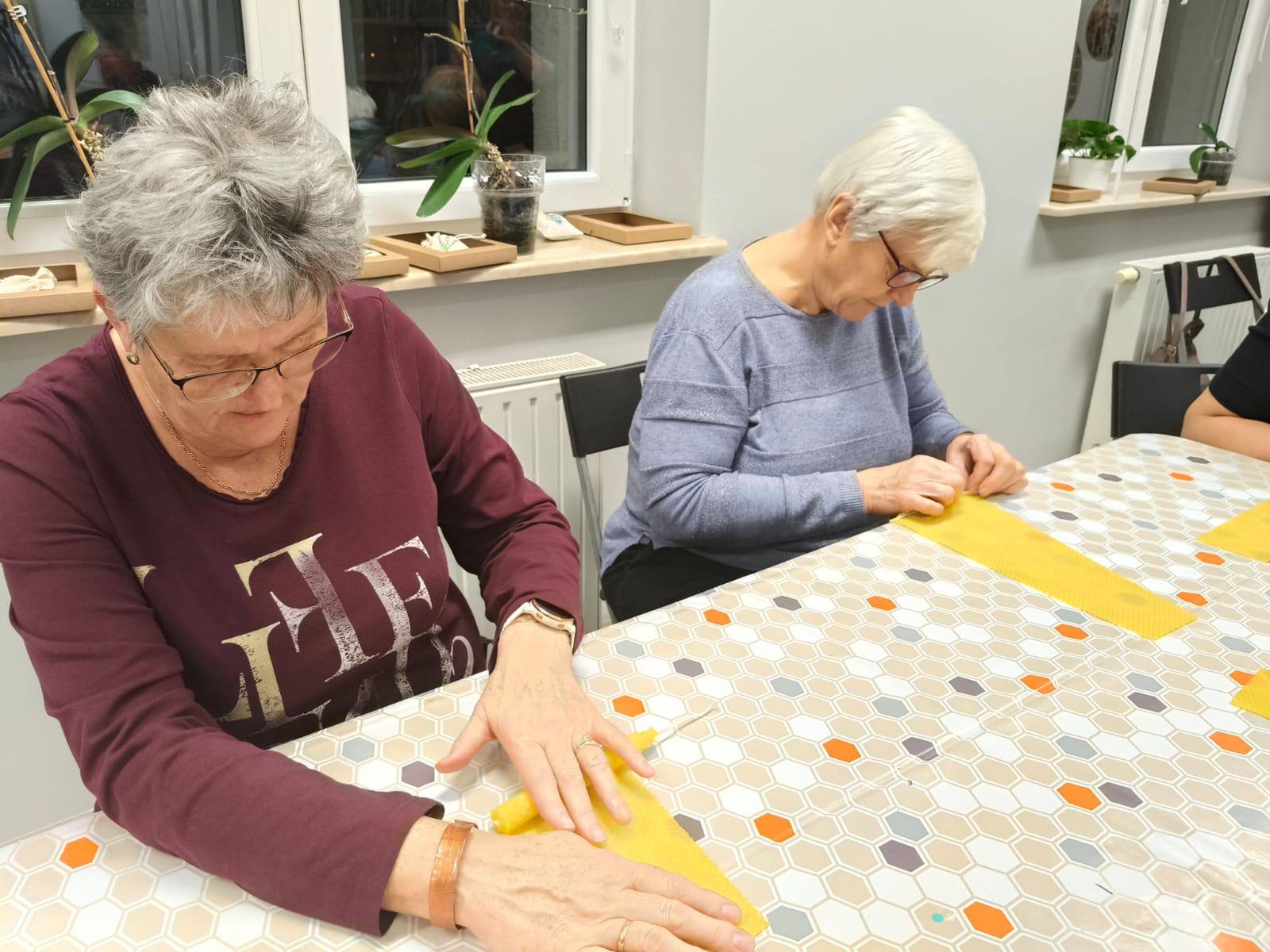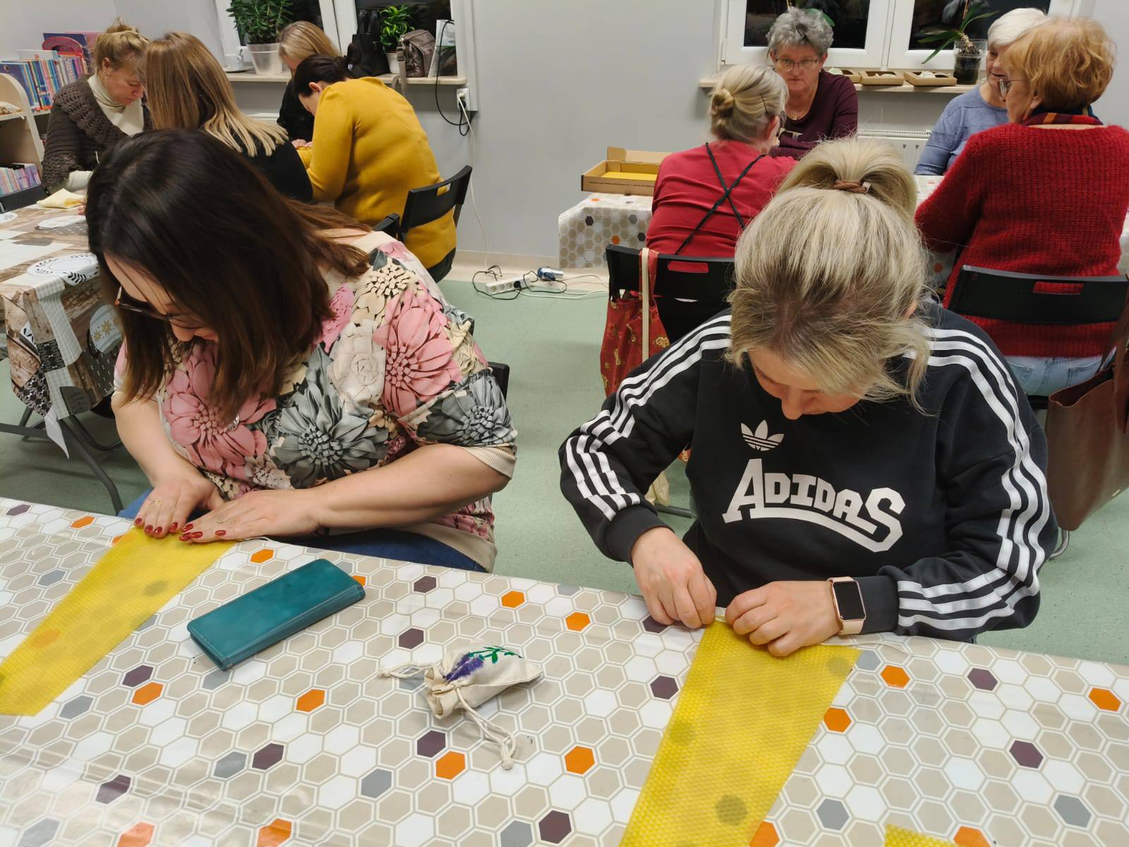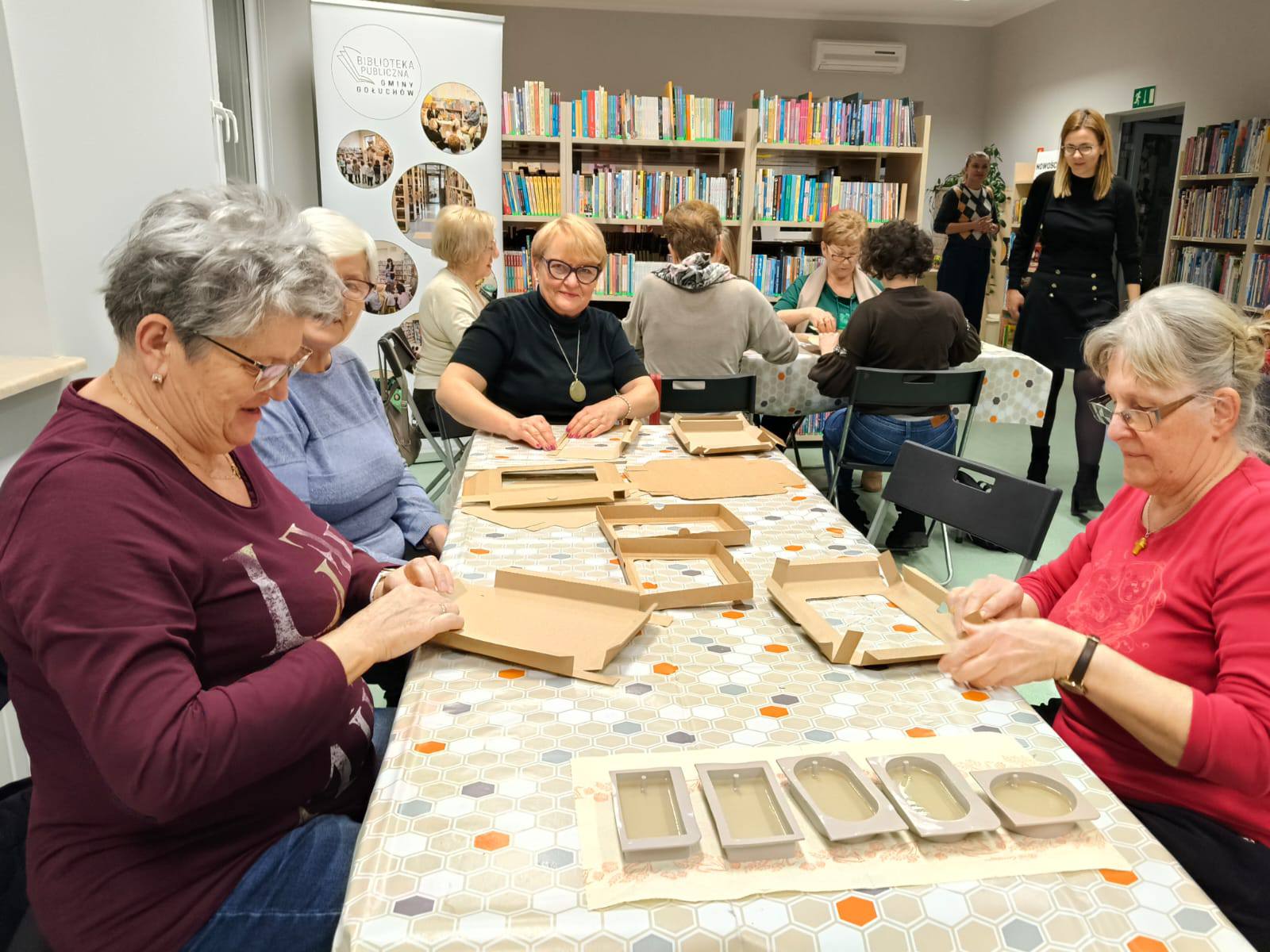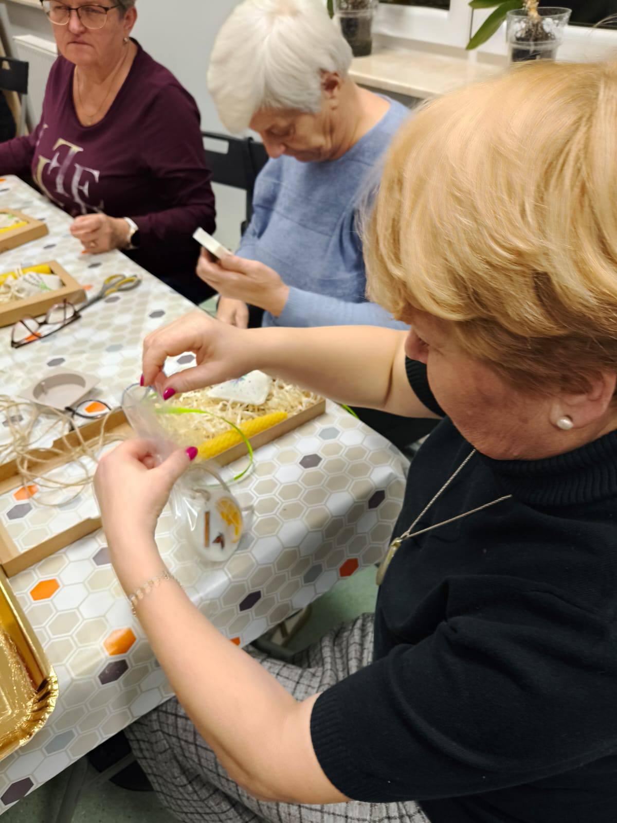 Spotkanie rozpoczęło się od tworzenia florenckich tabliczek zapachowych z wosku sojowego, który obok pszczelego uważany jest za jeden z najzdrowszych. Każda uczestniczka mogła skomponować swoją mieszankę i choć wybór był naprawdę imponujący w grudniowym klimacie dominowały zapachy pomarańczy, cynamonu oraz goździków, które wypełniły bibliotekę aromatem świąt. Następnie przyszedł czas na działania plastyczne. Panie ozdabiały materiałowe woreczki, które później wypełniły suszoną lawendą oraz olejkami, tworząc pachnące i efektowne upominki. Kolejnym etapem warsztatów było wykonanie świec z węzy pszczelej, cenionej za swoje właściwości i delikatny, miodowy zapach. Na zakończenie wszystkie prace zostały starannie zapakowane w kartoniki, by stać się wyjątkowymi, bo wykonanymi własnoręcznie, prezentami świątecznymi. W trakcie spotkania Hanna Wojtyczka opowiadała mnóstwo ciekawostek na temat właściwości wosku oraz ziół.