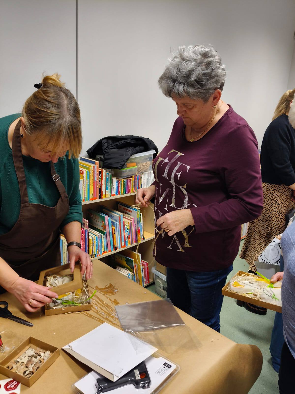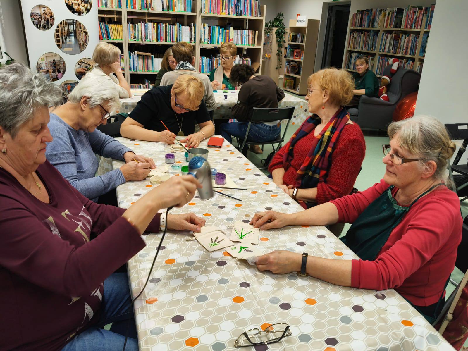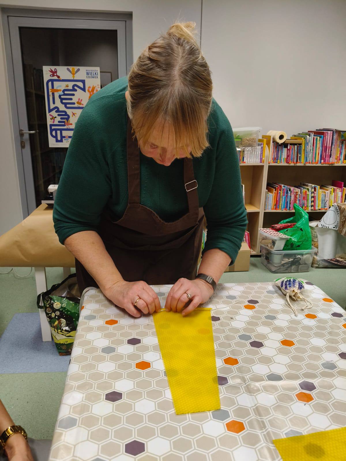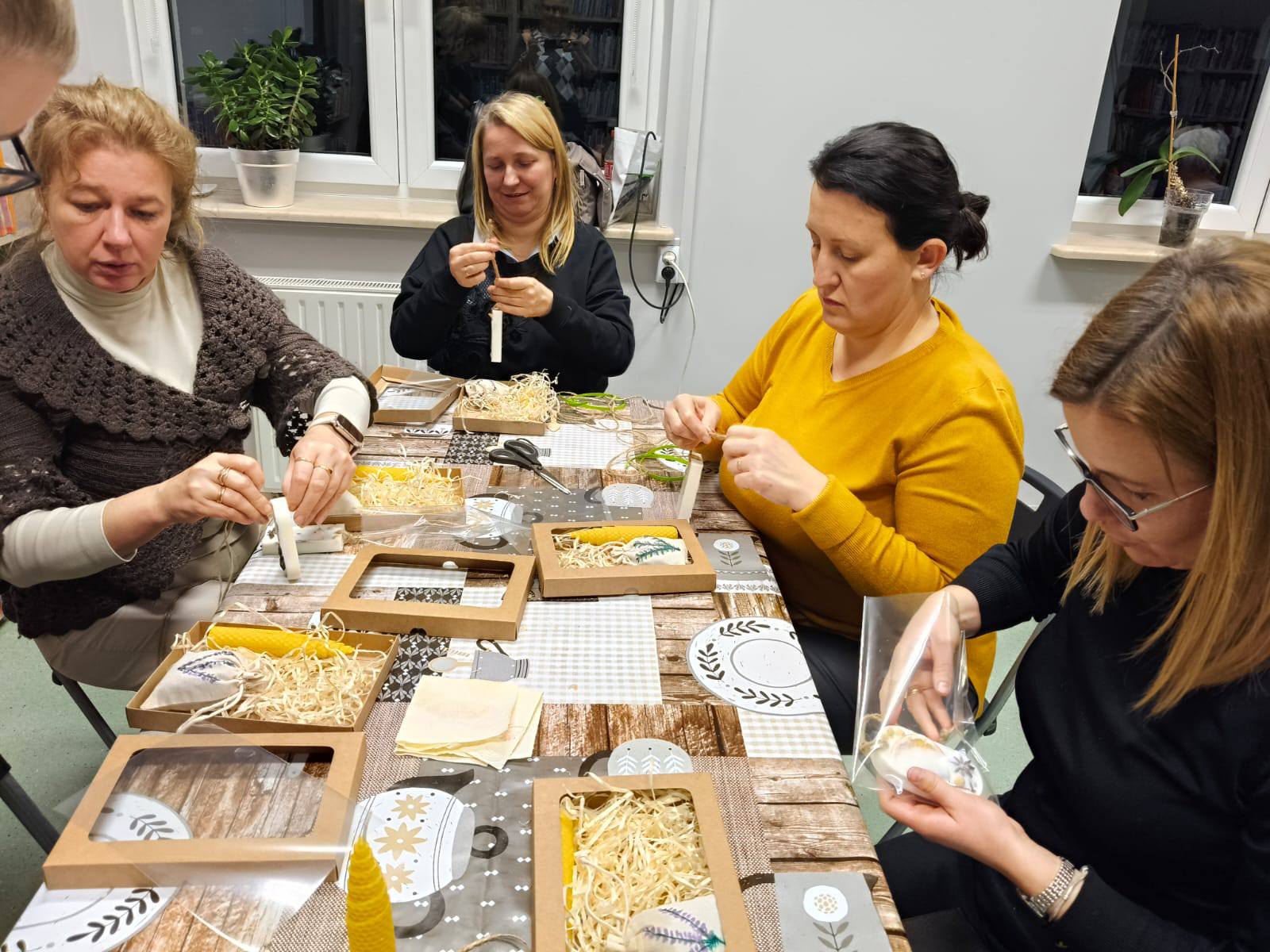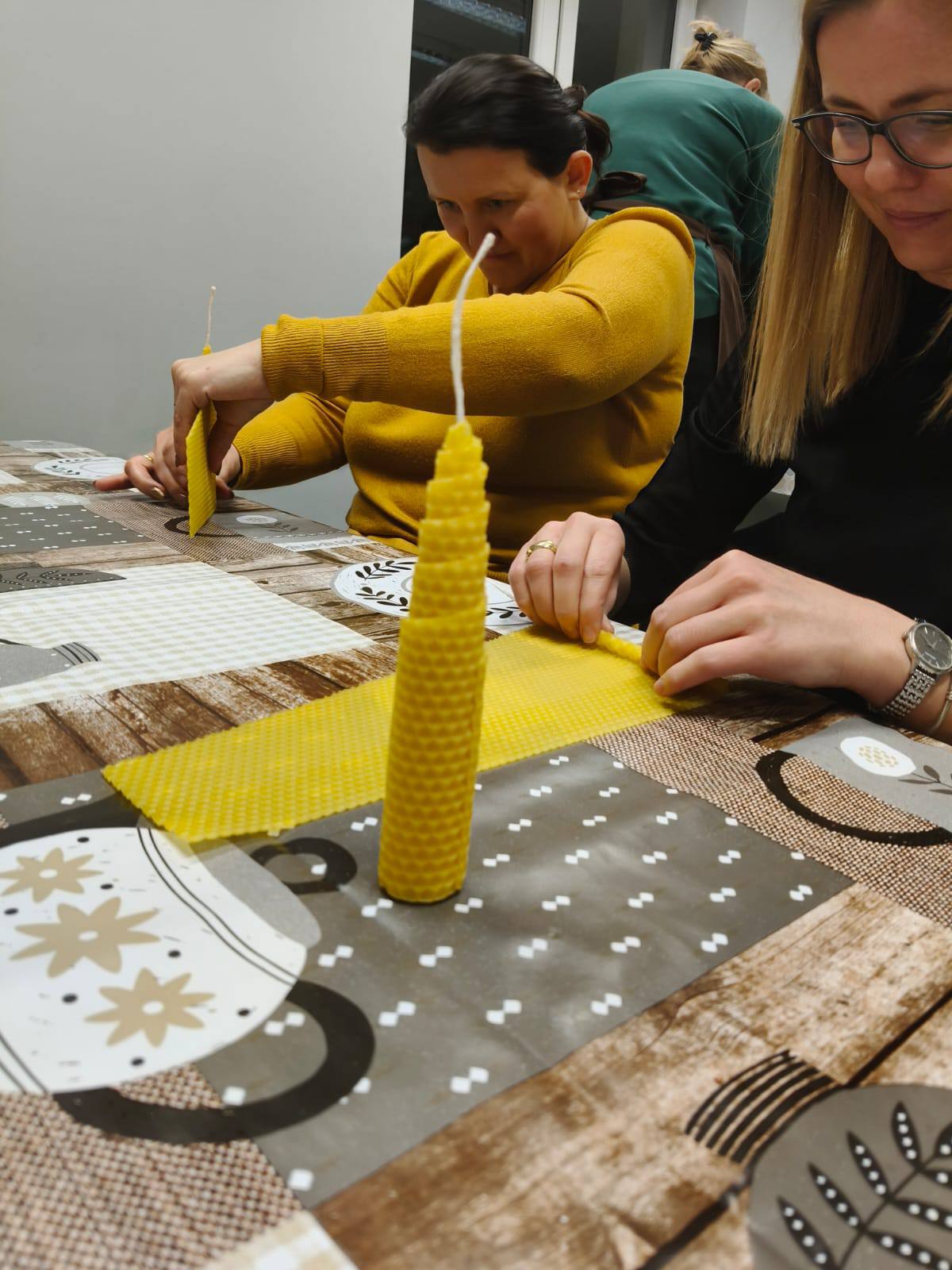 Spotkanie rozpoczęło się od tworzenia florenckich tabliczek zapachowych z wosku sojowego, który obok pszczelego uważany jest za jeden z najzdrowszych. Każda uczestniczka mogła skomponować swoją mieszankę i choć wybór był naprawdę imponujący w grudniowym klimacie dominowały zapachy pomarańczy, cynamonu oraz goździków, które wypełniły bibliotekę aromatem świąt. Następnie przyszedł czas na działania plastyczne. Panie ozdabiały materiałowe woreczki, które później wypełniły suszoną lawendą oraz olejkami, tworząc pachnące i efektowne upominki. Kolejnym etapem warsztatów było wykonanie świec z węzy pszczelej, cenionej za swoje właściwości i delikatny, miodowy zapach. Na zakończenie wszystkie prace zostały starannie zapakowane w kartoniki, by stać się wyjątkowymi, bo wykonanymi własnoręcznie, prezentami świątecznymi. W trakcie spotkania Hanna Wojtyczka opowiadała mnóstwo ciekawostek na temat właściwości wosku oraz ziół.